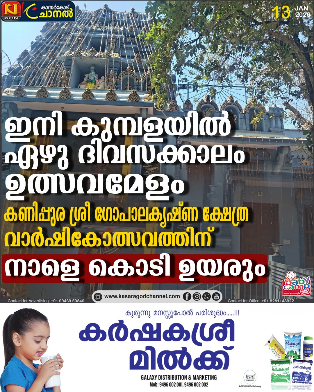 കുമ്പള.കുമ്പളയില് ഇനി ഏഴ് ദിവസക്കാലം ഉത്സവമേളം.കണിപുര ശ്രീ ഗോപാലകൃഷ്ണ ക്ഷേത്ര വാര്ഷികോത്സവത്തിന്