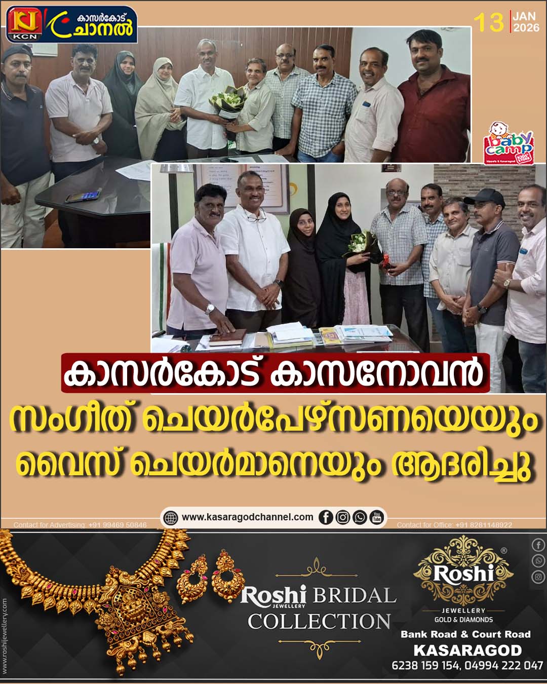 കാസര്കോട്:കാസനോവന് സംഗീത് ചെയര്പേഴ്സണ് സാഹിന സലീമിനേയും വൈസ് ചെയര്മാന് കെ എം ഹനീഫയേയും ആദരിച്ചു. സമീര് കാസനോവ, ഹാഫിസ് പള്ളിക്കാല്,മുസ്തഫ പള്ളിക്കാല്, ഗഫൂര് ബോക്കാച്ചി ,റാഫി ചെമനാട്, ഷാഫി തെരുവത്ത് സംബന്ധിച്ചു.