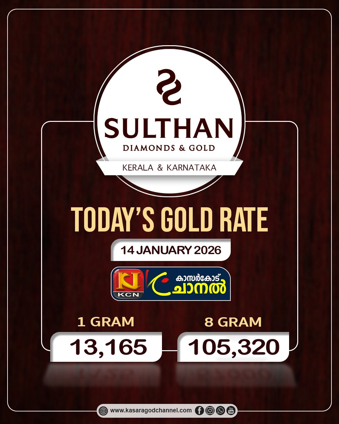 സ്വര്ണ്ണവില ഉയര്ന്നുBy kcnchannel / January 14, 2026 ഒരു ഗ്രാം സ്വര്ണ്ണത്തിന്റെ ഇന്നത്തെ വില 13165 രൂപയും ഒരു പവന് സ്വര്ണ്ണത്തിന്റെ വില 105320 രൂപയുമാണ്