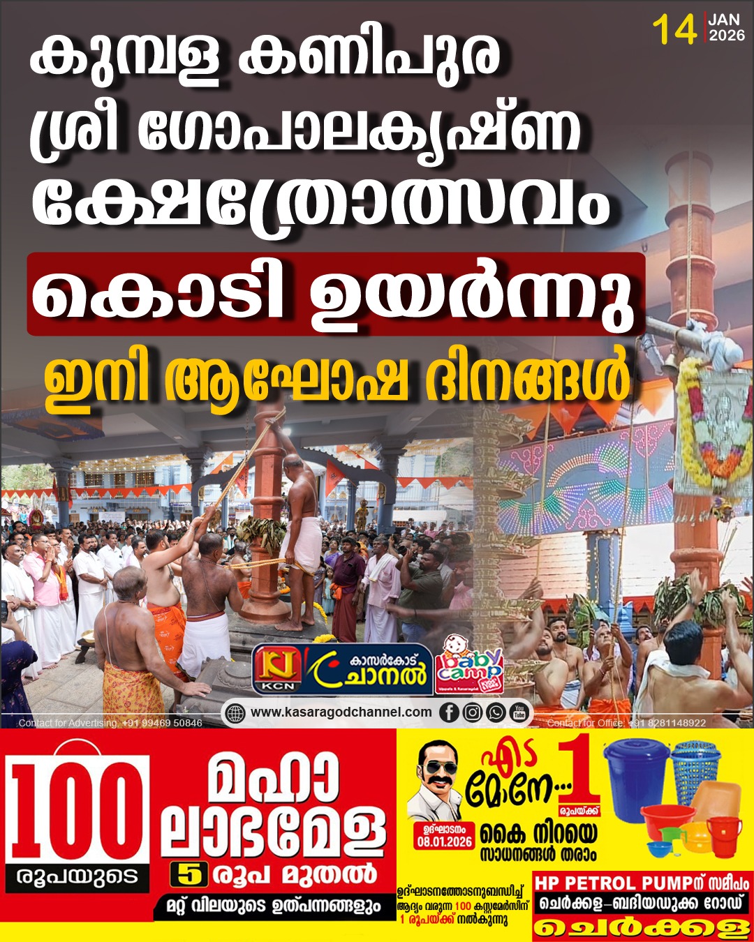 കുമ്പള.കുമ്പള കണിപുര ശ്രീ ഗോപാലകൃഷ്ണ ക്ഷേത്രോത്സവത്തിന് ഭക്തിസാന്ദ്രമായ അന്തരീക്ഷത്തില്കൊടി ഉയര്ന്നു.ഇനി കുമ്പളയില് ഒരാഴ്ചക്കാലം ആഘോഷം. ഭക്തജനങ്ങള് നേര്ച്ചയുമായി എത്തിത്തുടങ്ങി.