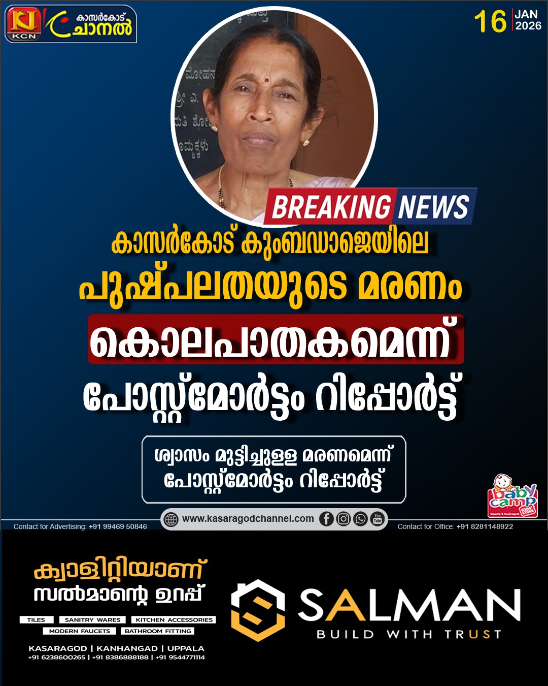 കാസര്കോട് കുംബഡാജെയിലെ പുഷ്പലതയുടെ മരണം;കൊലപാതകമെന്ന് പോസ്റ്റ്മോര്ട്ടം റിപ്പോര്ട്ട്