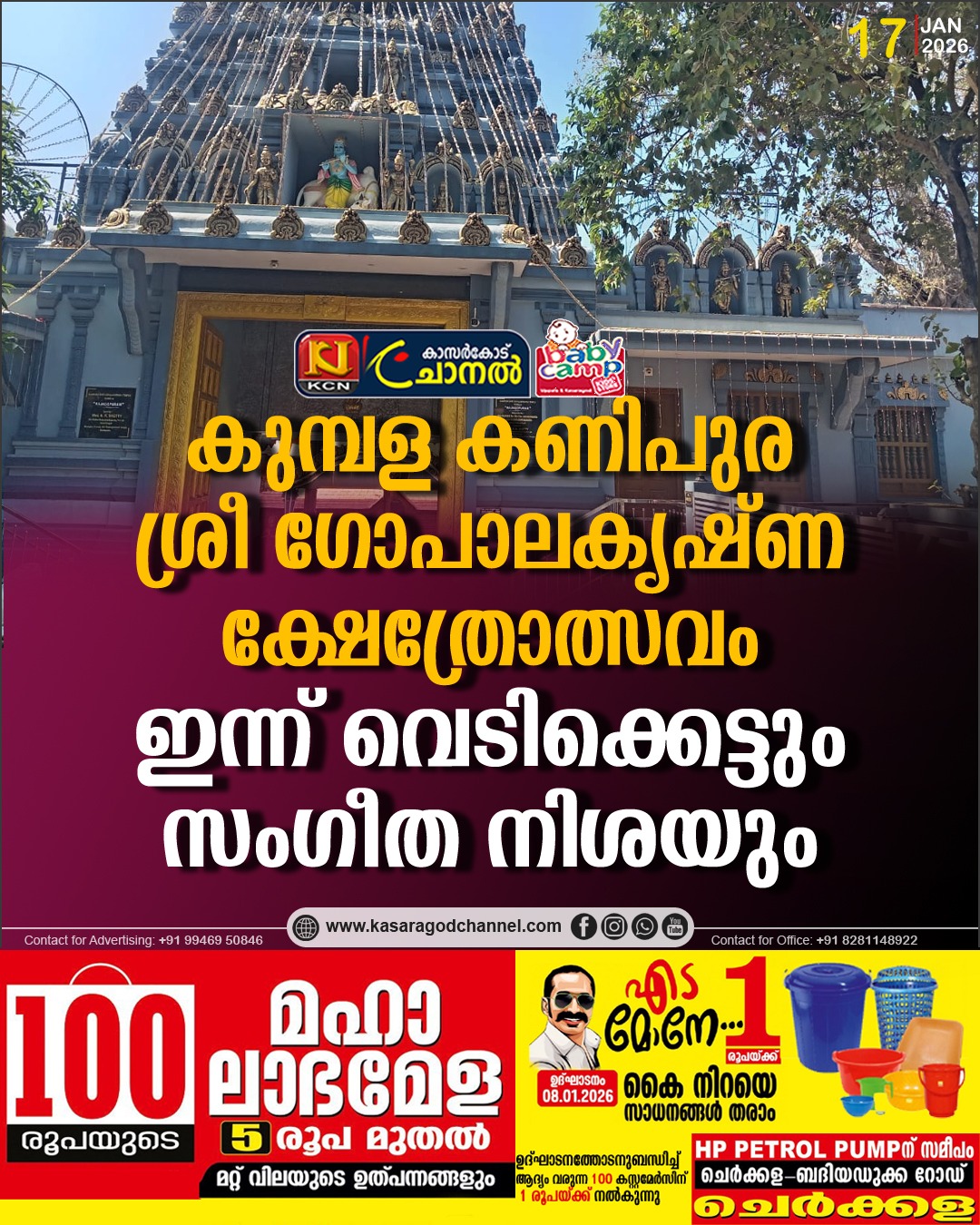 കുമ്പള.കുമ്പള കണിപുര ശ്രീ ഗോപാലകൃഷ്ണ ക്ഷേത്രോത്സവത്തിനന്റെ പ്രധാന ചടങ്ങായ കരിമരുന്ന് പ്രയോഗം(വെടി ക്കെട്ട്)ഇന്ന് നടക്കും. ആഘോഷം പൊലിപ്പിക്കാന് ചിരഞ്ജീവി ആര്ട്സ് ആന്ഡ് സ്പോര്ട്സ് ക്ലബ് കുമ്പളയുടെ സംഗീത നിശയും(മ്യൂസിക്കല് നൈറ്റ്)അരങ്ങേറും.