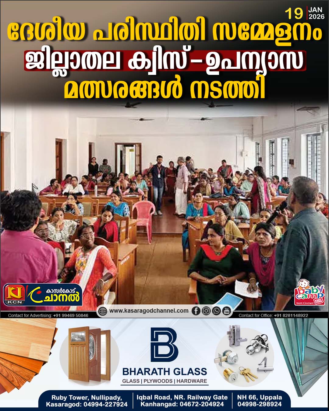 കാസര്കോട് : ദേശീയ പരിസ്ഥിതി സമ്മേളനത്തിന്റെ ഭാഗമായി ജില്ലാതല മത്സരങ്ങള് നടത്തി. ഹരിതകര്മസേനാംഗങ്ങള്ക്കുള്ള ക്വിസ്, യുപി, ഹൈസ്കൂള് വിഭാഗം വിദ്യാര്ഥികള്ക്കുള്ള ക്വിസ്, ഹൈസ്കൂള്, ഹയര്സെക്കന്ഡറി വിഭാഗത്തിനും കോളേജ് വിഭാഗത്തിനുമുള്ള ജില്ലാതല ഉപന്യാസമത്സരങ്ങളുമാണ് സംഘടിപ്പിച്ചത്. ജില്ലാ പഞ്ചായത്ത് വൈസ് പ്രസിഡന്റ് കെ.കെ. സോയ ഉദ്ഘാടനം ചെയ്തു.