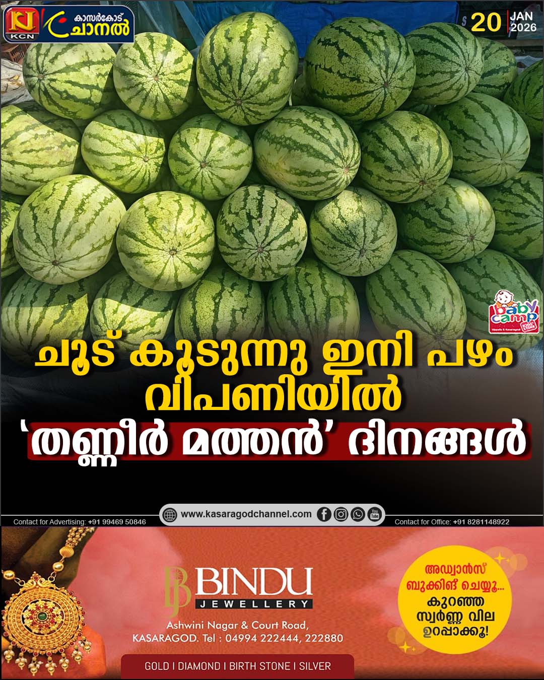 കാസര്ഗോഡ്. തട്ടുകടകളിലെ ‘ബത്തക്ക” സര്ബത്തുകള്ക്ക് പിന്നാലെ ഇനി പഴം വിപണിയില് ഏറെ ചിലവാകുക തണ്ണീര് മത്തനുകളാവും.ധനു മാസം അവസാനിച്ച് മകരമാസത്തിലേക്ക് കടക്കുമ്പോള് പൊതുവേ തണുത്ത കാലാവസ്ഥയാണ് ഉണ്ടാകാറെങ്കിലും കാലാവസ്ഥയില് വന്ന വ്യതിയാനവും, തുലാം,വൃശ്ചിക മാസത്തില് ലഭിക്കാതെ പോയ മഴയും കാരണം നേരത്തെ ഉണ്ടായിരുന്ന കാലാവസ്ഥ വിലയിരുത്തലുകളൊക്കെ മാറിമറിഞ്ഞു. രാവിലെ 10 മണി വരെ ശൈത്യ കാലാവസ്ത അനുഭവപ്പെടുന്നുണ്ടെങ്കിലും 11 മണിയോടെ നല്ല ചൂട് കാലം അനുഭവപ്പെട്ട് തുടങ്ങിയിട്ടുണ്ട്. അതുകൊണ്ടുതന്നെ ജനങ്ങള്ക്ക് ‘ദാഹം” അനുഭവപ്പെട്ട് തുടങ്ങിയിട്ടുമുണ്ട്. പ്രത്യേകിച്ച് കാല്നടയാത്രക്കാര്ക്ക്.