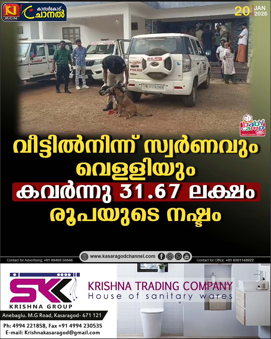 കാസര്കോട് ബാറിലെ അഭിഭാഷകയായ ചൈത്ര, മറ്റു കുടുംബാംഗങ്ങളോടൊപ്പം കുമ്പള കണിപുര ഗോപാലകൃഷ്ണ ക്ഷേത്രത്തില് ആറാട്ടുത്സവത്തിന് പോയിരുന്നു. വൈകിട്ട് ആറരയ്ക്കും എട്ടിനുമിടയിലാണ് മോഷണം നടന്നത്. വീട്ടിലെത്തി വാതില് തുറന്നപ്പോള് മുറികള്ക്കുള്ളില് വെളിച്ചം കണ്ടു.