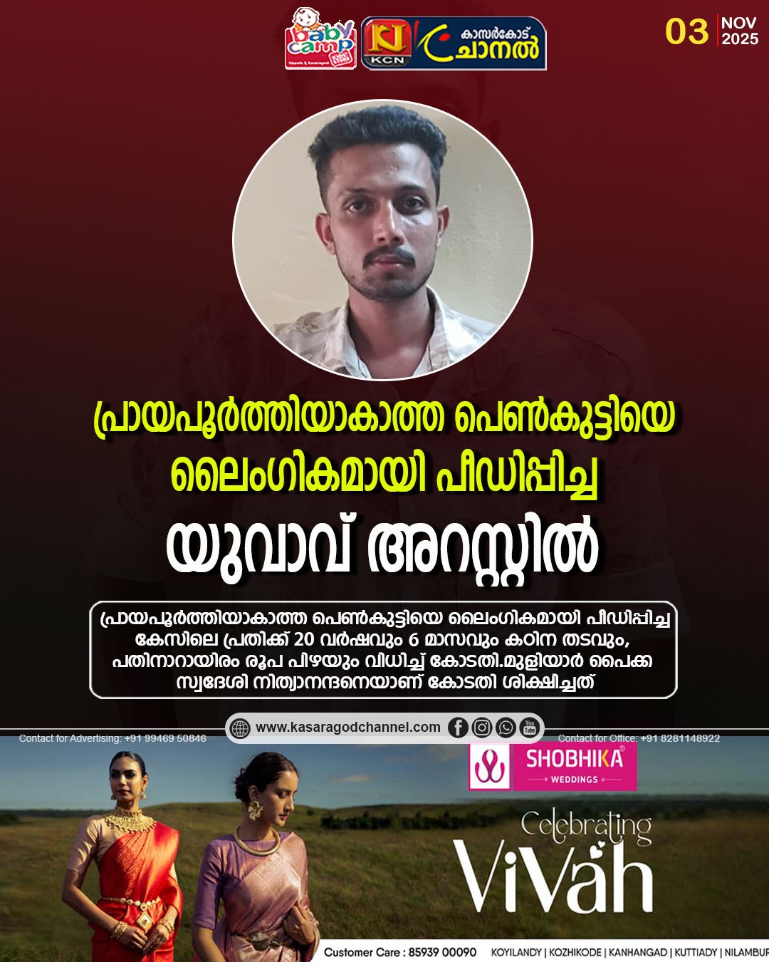 കാസര്കോട്: പ്രായപൂര്ത്തിയാകാത്ത പെണ്കുട്ടിയെ ലൈംഗികമായി പീഡിപ്പിച്ച കേസിലെ പ്രതിക്ക് 20 വര്ഷവും 6 മാസവും കഠിന തടവും, പതിനാറായിരം രൂപ പിഴയും വിധിച്ച് കോടതി. മുളിയാര് പൈക്ക സ്വദേശി നിത്യാനന്ദനെയാണ് കോടതി ശിക്ഷിച്ചത്. ഹോസ്ദുര്ഗ് പോക്സോ അതിവേഗ കോടതി ജഡ്ജ് സുരേഷ് പി എം ന്റേതാണ് വിധി. 2023 ജൂലൈലാണ് ആദൂര് പോലീസ് സ്റ്റേഷന് പരിധിയിലെ താമസക്കാരിയായ 14 കാരിയെ ആള്ത്താമസമില്ലാത്ത വീട്ടില് കൊണ്ടുപോയി ലൈംഗിക അതിക്രമത്തിനിരയാക്കിയത്. കേസ്സില് അന്വേഷണം നടത്തി കോടതിയില് കുറ്റപത്രം സമര്പ്പിച്ചത് അന്നത്തെ ഇന്സ്പെക്ടര് ഓഫ് പോലീസ് ആയിരുന്ന അനില്കുമാര് എ ആണ്. പ്രോസീക്യൂഷന് സ്പെഷ്യല് പബ്ലിക് പ്രോസീക്യൂട്ടര് ഗംഗാധരന് എ ഹാജരായി.