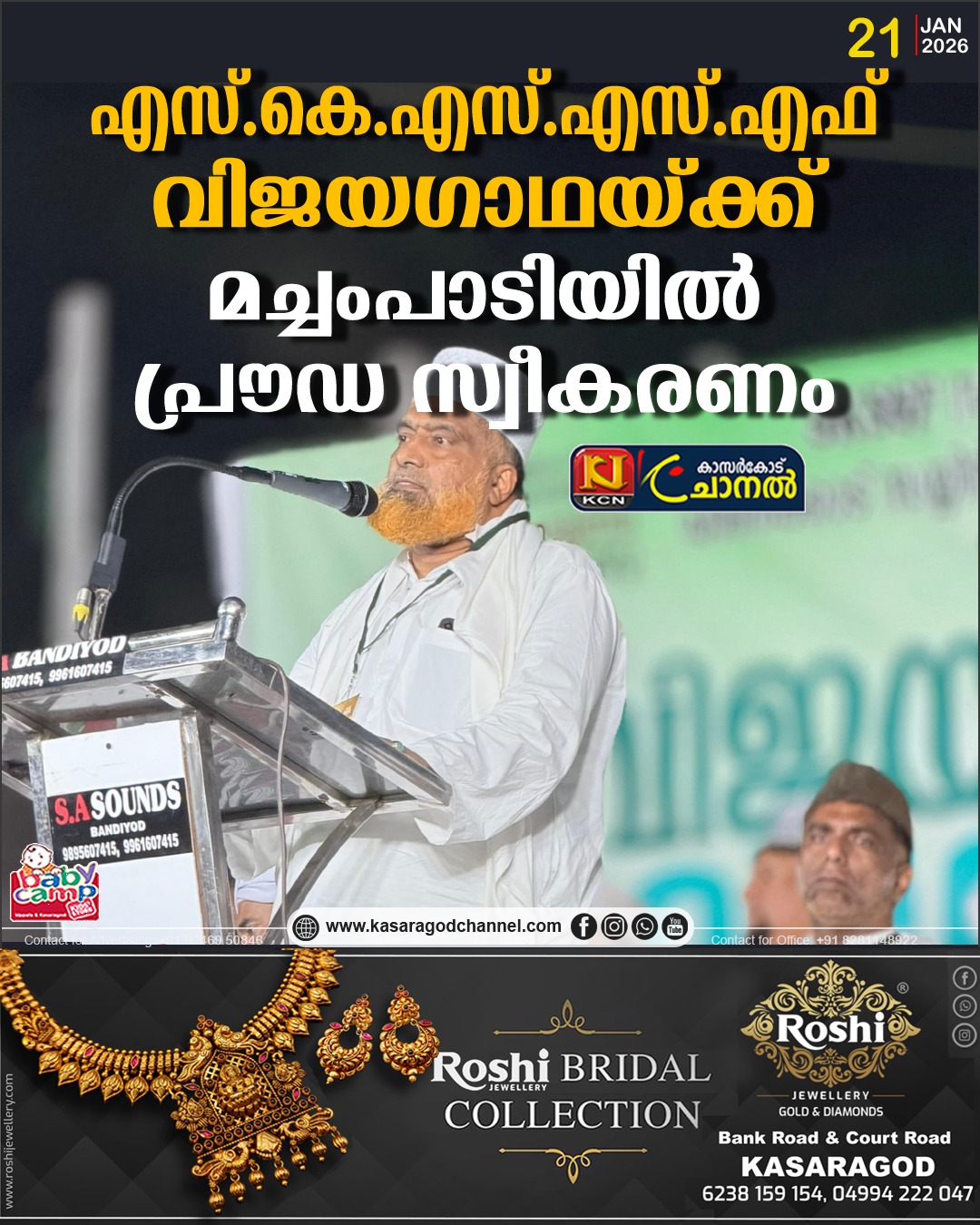 സമസ്ത നൂറാം വാര്ഷിക സമ്മേളനത്തിന്റെ പ്രചരണാര്ത്ഥം എസ്.കെ.എസ്.എസ്.എഫ് കാസര്കോട് ജില്ലാ കമ്മിറ്റി സംഘടിപ്പിച്ച ‘വിജയഗാഥ’ പ്രചാരണ യാത്രക്ക് മച്ചംപാടിയില് പ്രൗഡമായ സ്വീകരണം നല്കി.