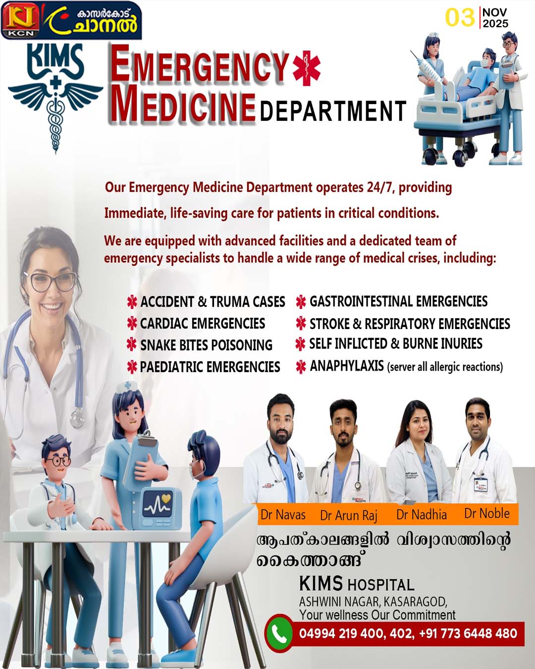 കാസര്ഗോഡ് കിംസ് ആശുപത്രിയില് എമര്ജന്സി മെഡിസിന് വിഭാഗം 24 മണിക്കൂര് പ്രവര്ത്തനമാരംഭിച്ചിരിക്കുന്നു.By kcnchannel / November 3, 2025