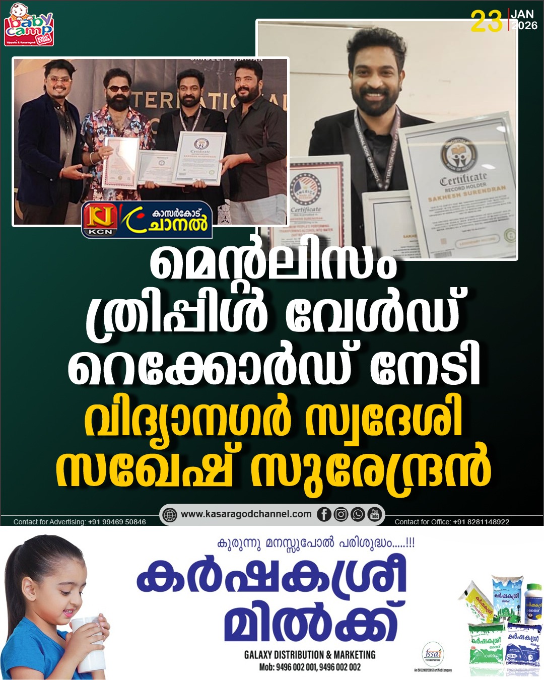 മെന്റലിസം ത്രിപ്പിള് വേള്ഡ് റെക്കോര്ഡ് നേടി വിദ്യാനഗര് സ്വദേശി സഖേഷ് സുരേന്ദ്രന്