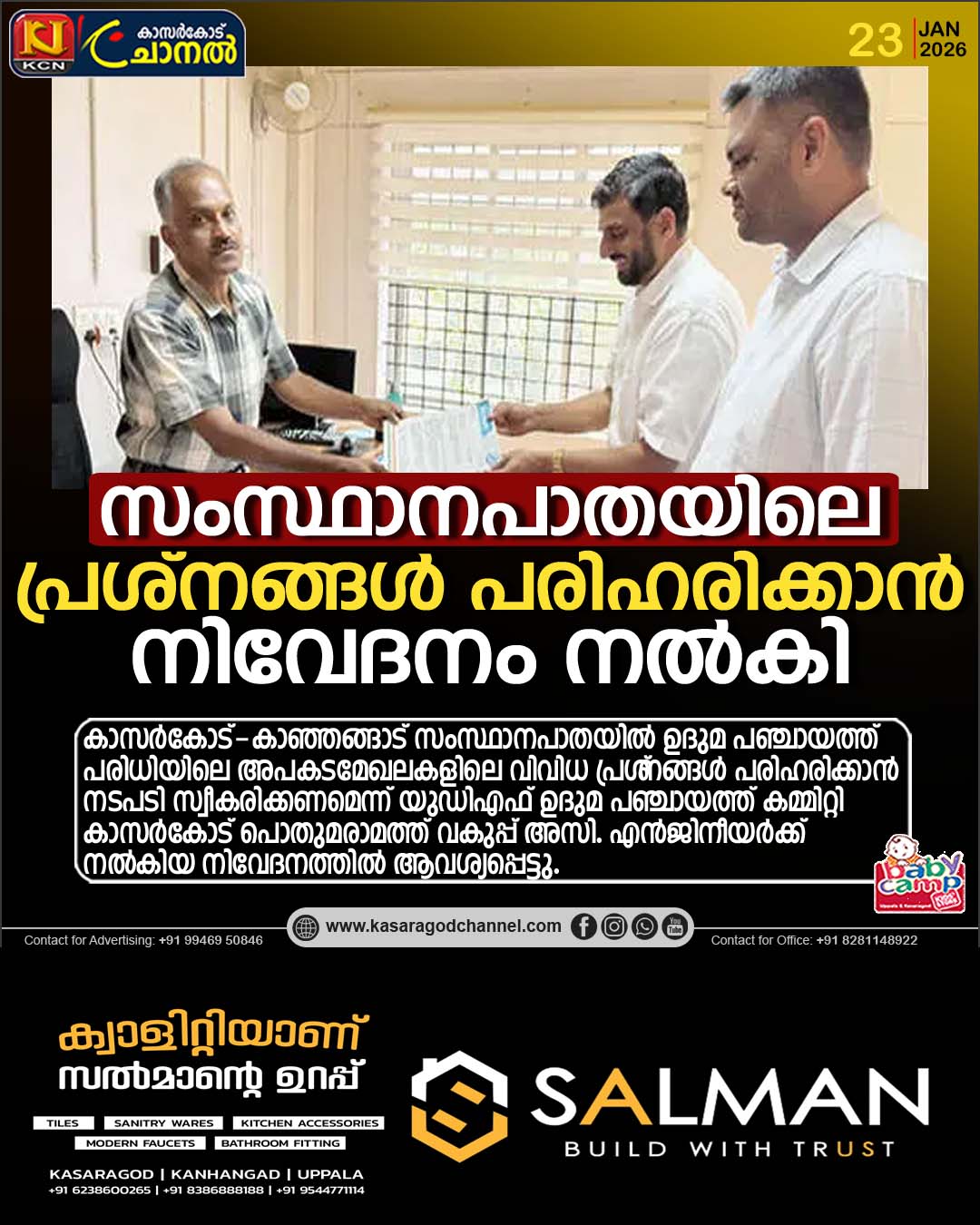 ഉദുമ : കാസര്കോട്-കാഞ്ഞങ്ങാട് സംസ്ഥാനപാതയില് ഉദുമ പഞ്ചായത്ത് പരിധിയിലെ അപകടമേഖലകളിലെ വിവിധ പ്രശ്നങ്ങള് പരിഹരിക്കാന് നടപടി സ്വീകരിക്കണമെന്ന് യുഡിഎഫ് ഉദുമ പഞ്ചായത്ത് കമ്മിറ്റി കാസര്കോട് പൊതുമരാമത്ത് വകുപ്പ് അസി. എന്ജിനീയര്ക്ക് നല്കിയ നിവേദനത്തില് ആവശ്യപ്പെട്ടു.