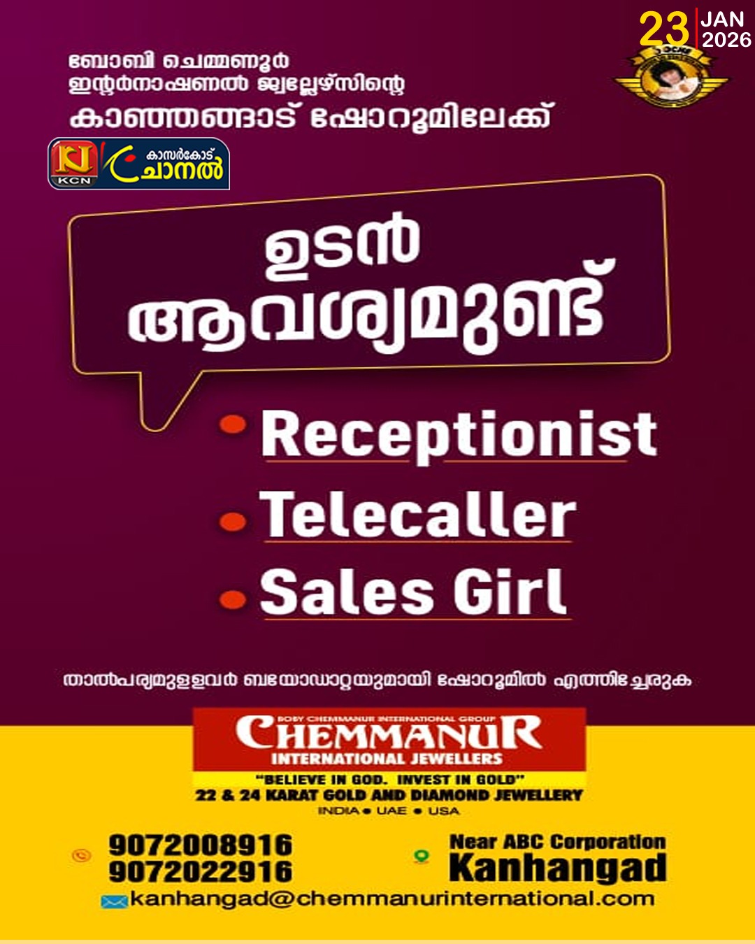 ബോബി ചെമ്മണ്ണൂര് ഇന്റര്നാഷണല് ജ്വല്ലേഴ്സിന്റെ കാഞ്ഞങ്ങാട് ഷോറൂമിലേക്ക് ഉടന് ആവശ്യമുണ്ട്By kcnchannel / January 23, 2026 RECEPTIONIST TELECALLER SALES GIRLതാല്പര്യമുള്ളവര് ബയോഡാറ്റയുമായി ഷോറൂമില് എത്തിച്ചേരുക