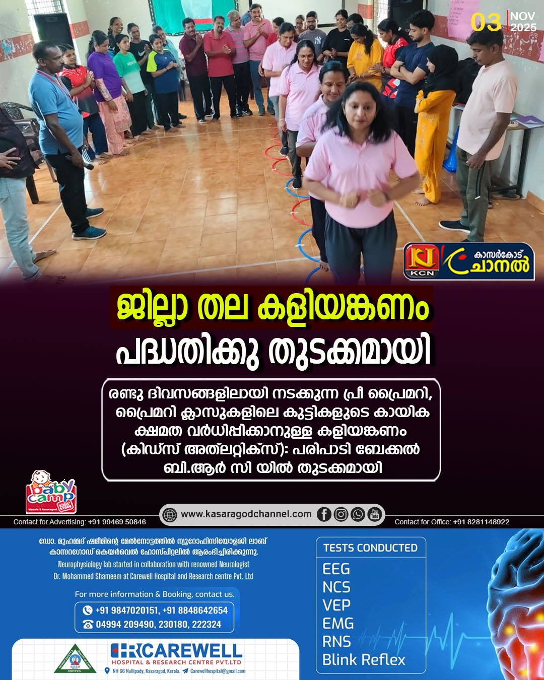 പാലക്കുന്ന്: രണ്ടു ദിവസങ്ങളിലായി നടക്കുന്ന പ്രീ പ്രൈമറി, പ്രൈമറി ക്ലാസുകളിലെ കുട്ടികളുടെ കായിക ക്ഷമത വര്ധിപ്പിക്കാനുള്ള കളിയങ്കണം (കിഡ്സ് അത്ലറ്റിക്സ്) : പരിപാടി ബേക്കല് ബി.ആര് സി യില് തുടക്കമായി. സമഗ്ര ശിക്ഷാ കേരളം സ്റ്റാര്സ് പദ്ധതി യുടെ ഭാഗമായാണ് ഈ പരിപാടി. പഠനത്തോടൊപ്പം കായിക ക്ഷമത ഉറപ്പുവരുത്താന് ആറുതരം കളിയുപകരണങ്ങളായ ഹുലാഹുപ്സ്, എജിലിറ്റി ഹഡില്സ്, ബിന്ബാഗ്, കോണുകള്, റിംഗ്, ടെന്നീസ് ബോള് എന്നിവയാണ് വിദ്യാലയങ്ങള്ക്ക് നല്കിയത്.