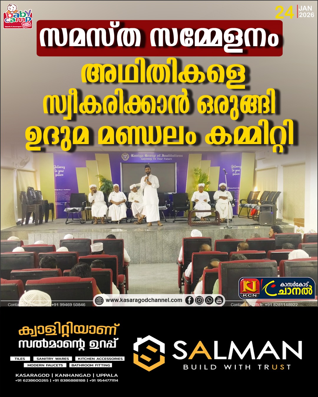 കുണിയ: സമസ്തയുടെ 100-ാം വാര്ഷിക മഹാസമ്മേളനത്തില് പങ്കെടുക്കാന് എത്തുന്ന ലക്ഷക്കണക്കിന് വിശ്വാസികളെ സ്വീകരിക്കാന് ഒരുങ്ങി സമസ്ത ഉദുമ മണ്ഡലം സ്വാഗതസംഘ സമിതി. സമ്മേളനവുമായി ബന്ധപ്പെട്ട ഒരുക്കങ്ങള് അവലോകനം ചെയ്യുന്നതിനായി ഉദുമ മണ്ഡലം സ്വാഗതസംഘ സമിതി കുണിയ ക്യാമ്പസില് വെച്ച് യോഗം ചേര്ന്നു. മഹാസമ്മേളനത്തിന് ആതിഥേയത്വം വഹിക്കുന്ന മണ്ഡലം എന്ന നിലയില് സ്വാഗതസംഘം ചെയ്യേണ്ട ഉത്തരവാദിത്വങ്ങള്, പ്രവര്ത്തനങ്ങളുടെ നിലവിലെ പുരോഗതി, വിവിധ സമിതികളുടെ ഏകോപനം എന്നിവ യോഗത്തില് വിശദമായി ചര്ച്ച ചെയ്തു.