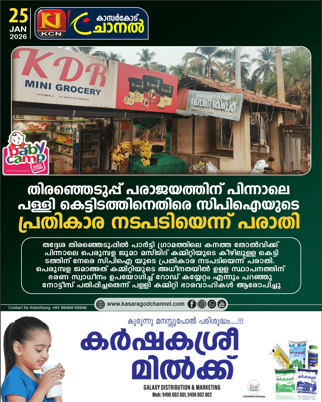 പെരുമ്പള: തദ്ദേശ തിരഞ്ഞെടുപ്പില് പാര്ട്ടി ഗ്രാമത്തിലെ കനത്ത തോല്വിക്ക് പിന്നാലെ പെരുമ്പള ജുമാ മസ്ജിദ് കമ്മിറ്റിയുടെ കീഴിലുള്ള കെട്ടിടത്തിന് നേരെ സിപിഐ യുടെ പ്രതികാര നടപടിയെന്ന് പരാതി. ചെമ്മനാട് ഗ്രാമ പഞ്ചായത്തിലെ മൂന്നാം വാര്ഡായ പെരുമ്പളയില് സിപിഐ മാത്രമാണ് വിജയിച്ചു പോന്നിരുന്നത്. എന്നാല് പഞ്ചായത്ത് തിരഞ്ഞെടുപ്പില് പെരുമ്പളയില് യു ഡി എഫ് ചരിത്ര വിജയം നേടിയതിന് പിന്നാലെയാണ് പെരുമ്പള ജമാഅത് കമ്മിറ്റിയുടെ അധീനതയില് ഉള്ള സ്ഥാപനത്തിന് ഭരണ സ്വാധീനം ഉപയോഗിച്ച് റോഡ് കയ്യേറ്റം എന്നും പറഞ്ഞു നോട്ടീസ് പതിപ്പിച്ചതെന്ന് പള്ളി കമ്മിറ്റി ഭാരവാഹികള് ആരോപിച്ചു.