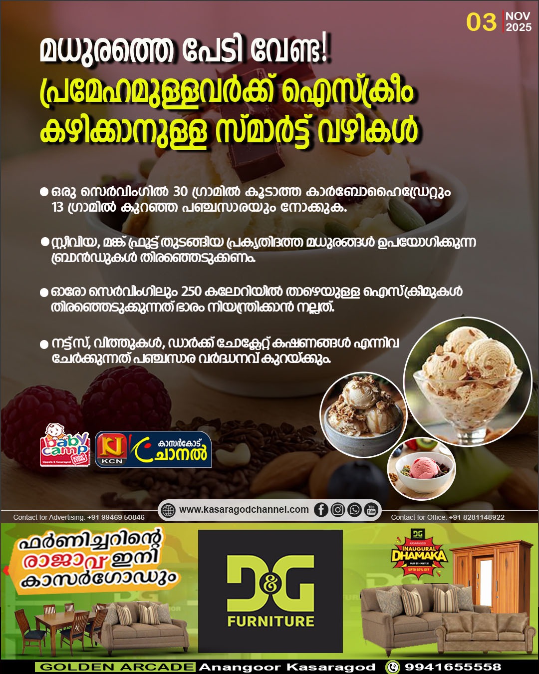 മധുരമില്ലാത്ത നട്ട്സ്, വിത്തുകള്, ഗ്രീക്ക് തൈര്, അല്ലെങ്കില് ഉയര്ന്ന പ്രോട്ടീനുള്ള കോണുകള് എന്നിവ ടോപ്പിംഗായി തിരഞ്ഞെടുക്കുക. പഞ്ചസാര ചേര്ത്ത സ്പ്രിങ്കിളുകളോ ഫഡ്ജോ പോലുള്ളവ ഒഴിവാക്കുക. കൂടാതെ, ഐസ്ക്രീം കഴിച്ച ശേഷം നിങ്ങളുടെ രക്തത്തിലെ പഞ്ചസാരയുടെ അളവില് ഉണ്ടാകുന്ന വ്യത്യാസം പതിവായി നിരീക്ഷിച്ച് വ്യക്തിഗതമായ ഫലങ്ങള് മനസിലാക്കണം.