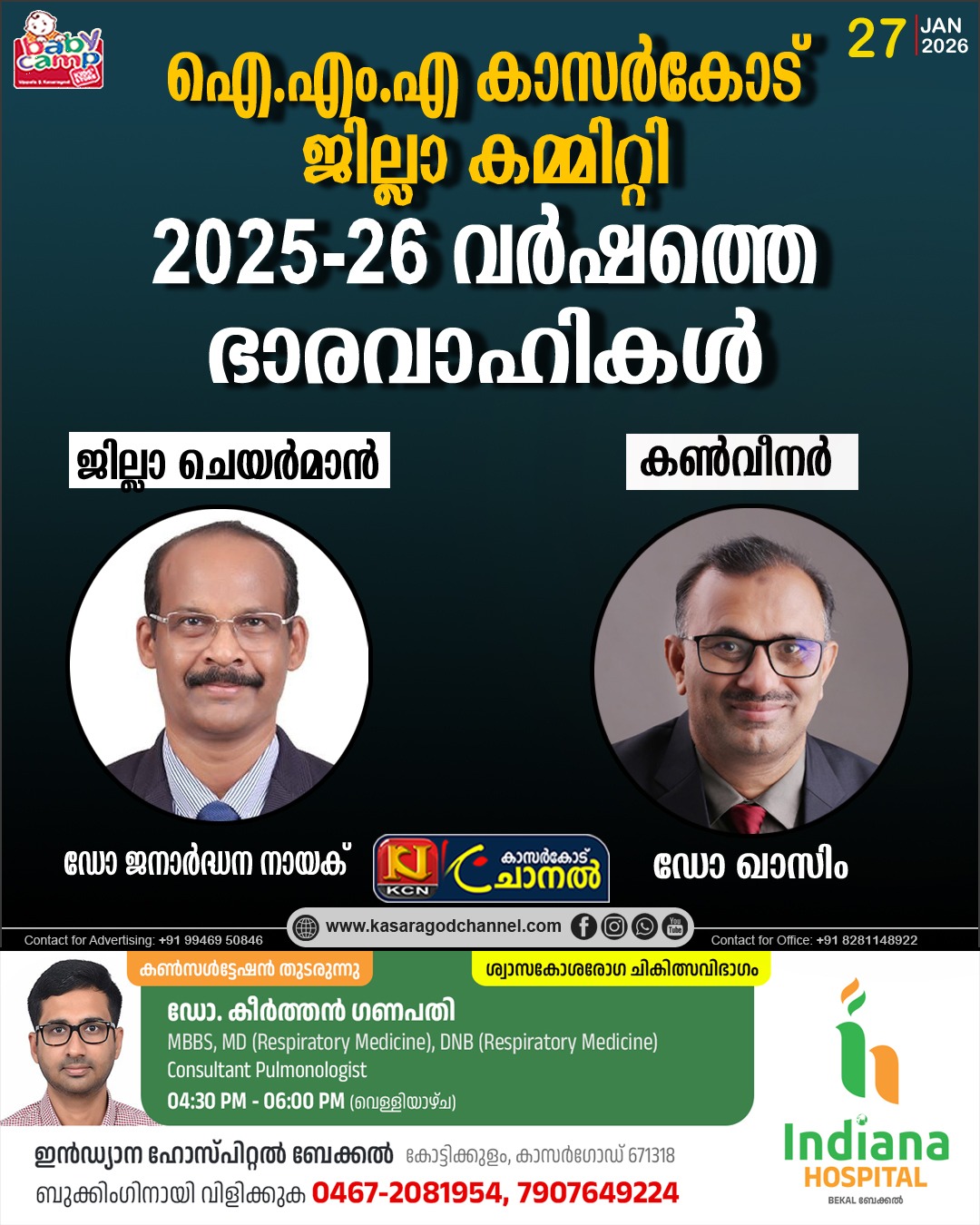 ഇന്ത്യന് മെഡിക്കല് അസോസിയേഷന് (ഐ.എം.എ) കാസര്ഗോഡ് ജില്ലാ കമ്മിറ്റിയുടെ 2025-26 വര്ഷത്തേക്കുള്ള ഭാരവാഹികളെ പ്രഖ്യാപിച്ചു.