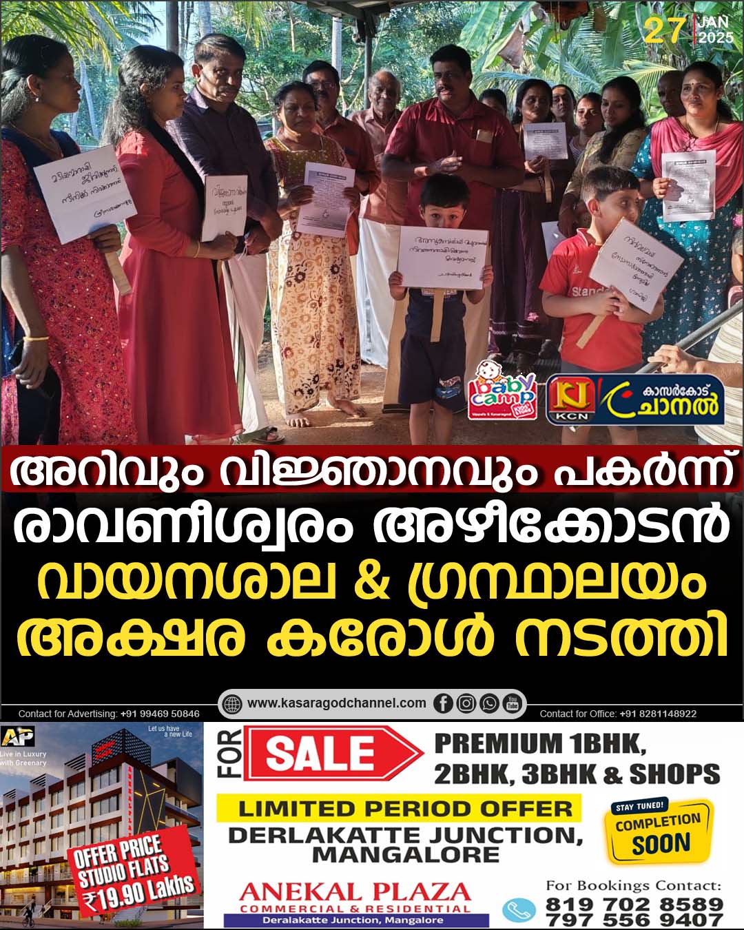 രാവണീശ്വരം ::വിജ്ഞാന വികാസം തുടരട്ടെ… സോദരത്വം പുലരട്ടെ…’ എന്ന പ്രഖ്യാപനത്തോടെ കേരള സ്റ്റേറ്റ് ലൈബ്രറി കൗണ്സിലിന്റെ ആഹ്വാനപ്രകാരം രാവണീശ്വരം അഴീക്കോടന് വായനശാല & ഗ്രന്ഥാലയം അക്ഷര കരോള് സംഘടിപ്പിച്ചു.മലയാള അക്ഷരങ്ങളുടെ കട്ടൗട്ടുകളും വിവിധ സാമൂഹിക പരിഷ്കര്ത്താക്കളുടെ ചിത്രങ്ങളോടുംകൂടി വാദ്യമേളത്തോടെ നടന്ന അക്ഷര കരോള് ജനശ്രദ്ധ ആകര്ഷിച്ചു.വായനയും അറിവും സമൂഹത്തിന്റെ പുരോഗതിക്ക് അനിവാര്യമാണെന്ന സന്ദേശം പരിപാടിയിലുടനീളം ഉയര്ത്തിക്കാട്ടി ഭരണഘടനയുടെ ആമുഖം പ്രദേശത്തെ വീടുകളില് വിതരണം ചെയ്തു.