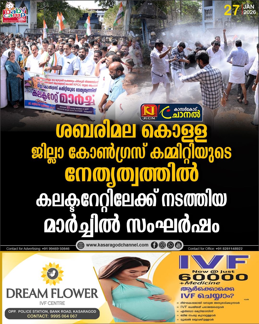 ശബരിമല കൊള്ളജില്ലാ കോണ്ഗ്രസ് കമ്മിറ്റിയുടെ നേതൃത്വത്തില് കലക്ടറേറ്റിലേക്ക് നടത്തിയ മാര്ച്ചില് സംഘര്ഷം.By kcnchannel / January 27, 2026 പ്രവര്ത്തകരെ പിരിച്ചുവിടാന് പോലീസ് ജലപീരങ്കി പ്രയോഗിച്ചു
