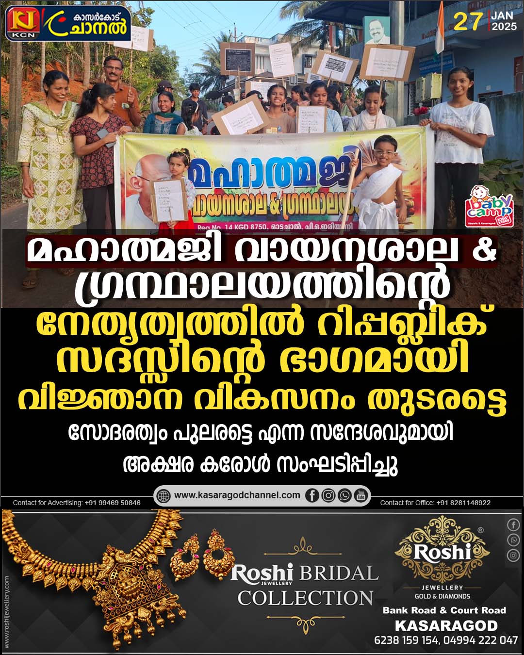 മഹാത്മജി വായനശാല & ഗ്രന്ഥാലയത്തിന്റെ നേതൃത്വത്തില് റിപ്പബ്ലിക് സദസ്സിന്റെ ഭാഗമായി വിജ്ഞാന വികസനം തുടരട്ടെ സോദരത്വം പുലരട്ടെ എന്ന സന്ദേശവുമായി അക്ഷര കരോള് സംഘടിപ്പിച്ചു.