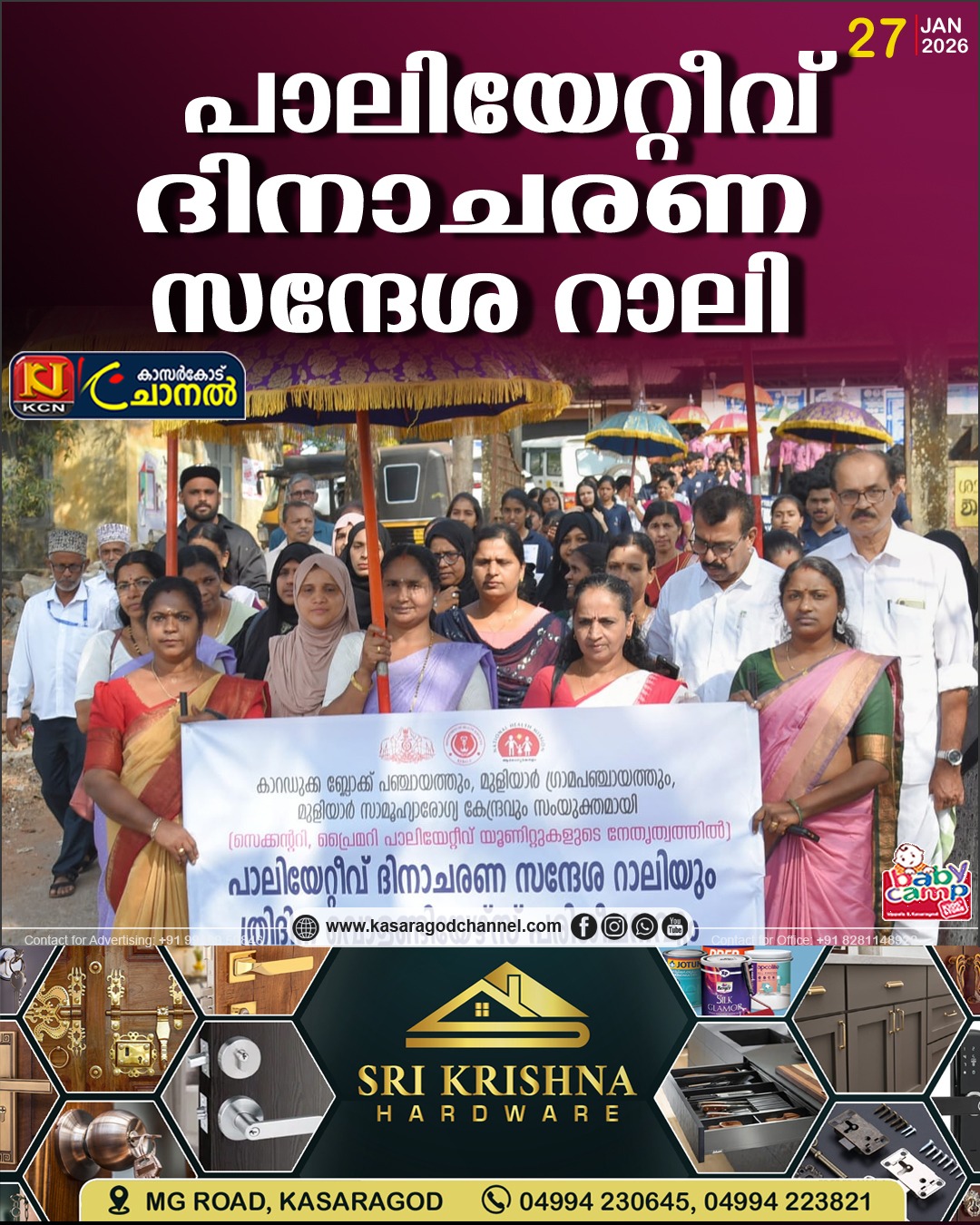 ബോവിക്കാനം:- കാറഡുക്ക ബ്ലോക്ക് പഞ്ചായത്തും മുളിയാര് ഗ്രാമപഞ്ചായത്തും മുളിയാര് ബ്ലോക്ക് കുടുംബാരോഗ്യ കേന്ദ്രവും സെക്കണ്ടറി, പ്രൈമറി പാലിയേറ്റീവ് കെയര് യൂണിറ്റ് എന്നിവയുടെ നേതൃത്തില് പാലിയേറ്റീവ് ദിനാചരണ സന്ദേശ റാലി സംഘടിപ്പിച്ചു.റാലിയില് ബ്ലോക്ക്, ഗ്രാമ പഞ്ചായത്ത് ജനപ്രതിനിധികള്, വിവിധ വിദ്യാലയങ്ങളിലെ എന് എസ് എസ് കുട്ടികള്, ആരോഗ്യ വകുപ്പ് ജീവനക്കാര്,ആശാ വര്ക്കര്മാര്, പാലിയേറ്റീവ് നഴ്സ്, പാലിയേറ്റീവ് വളണ്ടിയര്മാര് എന്നിവര് റാലിയില് പങ്കെടുത്തു. പഞ്ചായത്ത് പ്രസിഡണ്ട് കെ ബി മുഹമ്മദ് കുഞ്ഞി ഫ്ലാഗ് ഓഫ് ചെയ്ത് റാലി ഉദ്ഘാടനം ചെയ്തു. ബ്ലോക്ക് പഞ്ചായത്ത് അംഗങ്ങളായ കെ സുഗന്ധിനി, രൂപാ സത്യന്,കെ ശാന്തിനി ദേവി, ഗ്രാമ പഞ്ചായത്ത് വൈസ് പ്രസിഡന്റ് പുഷ്പ, ഗ്രാമ പഞ്ചായത്ത് അംഗങ്ങളായ അനീസ മന്സൂര് മല്ലത്ത്, ഇ മോഹനന്, എം അനന്യ, മിസ്രിയ റഫീഖ് എന്നിവര് നേതൃത്വം നല്കി. തുടര്ന്ന് ത്രിദിന വളണ്ടിയേഴ്സ് പരിശീലനത്തില് ഡോ ഷമീമ തന്വീര്, പാലിയേറ്റീവ് ജില്ലാ കോ ഓര്ഡിനേറ്റര് ഷിജി മനോജ് എന്നിവര് ക്ലാസ്സെടുത്തു.ഹെല്ത്ത് ഇന്സ്പെക്ടര് പി കുഞ്ഞികൃഷ്ണന് നായര് സ്വാഗതവും എല് രഞ്ജുഷ നായര് നന്ദിയും പറഞ്ഞു.