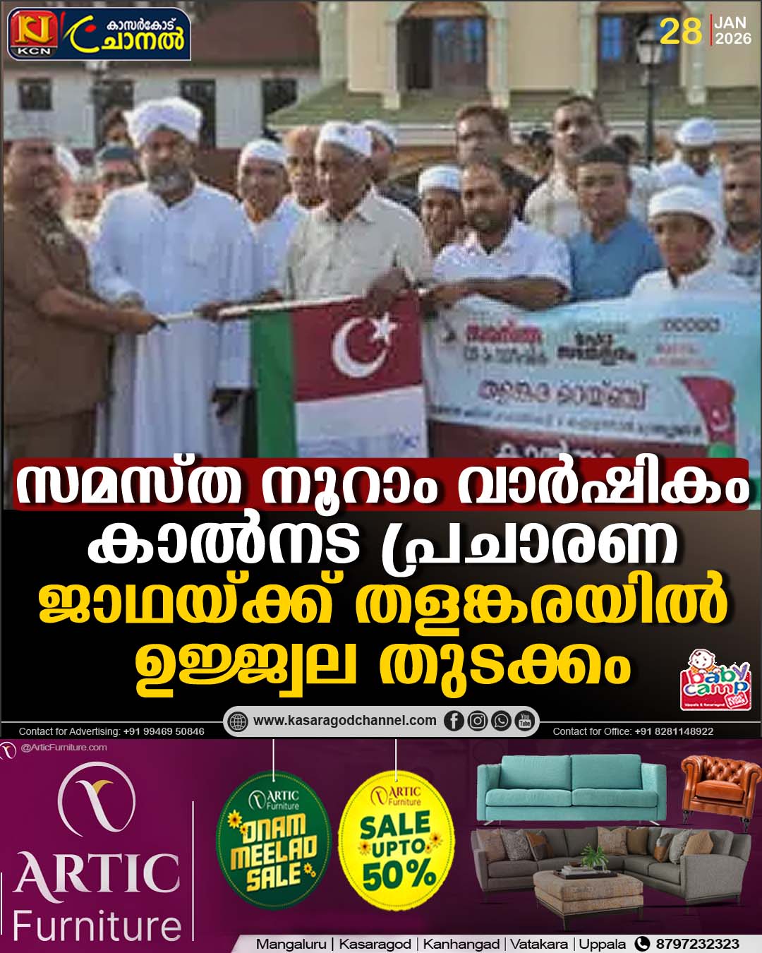 നടക്കുന്ന അന്താരാഷ്ട്ര സമ്മേളനത്തിന്റെ പ്രചാരണ ഭാഗമായി സമസ്ത മദ്രസ മാനേജ്മെന്റ്, ജംഇയ്യത്തുല് മുഅല്ലിമീന് തളങ്കര റെയിഞ്ചിന്റെ ആഭിമുഖ്യത്തില് നടത്തുന്ന കാല്നട ജാഥയ്ക്ക് തളങ്കരയില് ഉജ്ജ്വല തുടക്കം. മാലിക് ദീനാര് പള്ളിപരിസരത്ത് തളങ്കര റെയിഞ്ച് പ്രസിഡന്റ് ഹസൈനാര് ഹാജി തളങ്കരയ്ക്ക് പതാക കൈമാറി ജില്ലാ സെക്രട്ടറി റഷീദ് ബെളിഞ്ചം ഉദ്ഘാടനം ചെയ്.