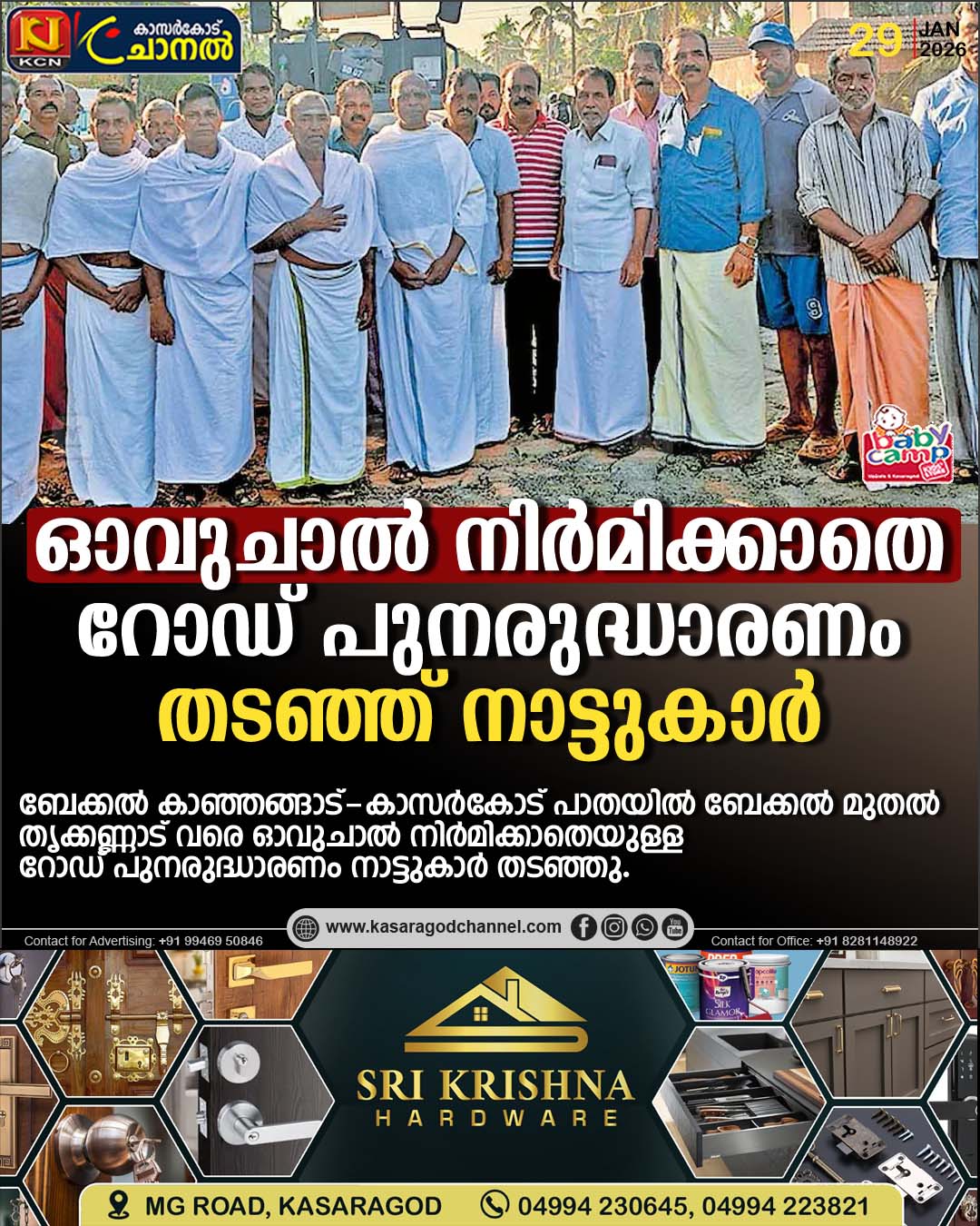 ബേക്കല് കാഞ്ഞങ്ങാട്-കാസര്കോട് പാതയില് ബേക്കല് മുതല് തൃക്കണ്ണാട് വരെ ഓവുചാല് നിര്മിക്കാതെയുള്ള റോഡ് പുനരുദ്ധാരണം നാട്ടുകാര് തടഞ്ഞു. കോട്ടിക്കുളം കുറുംബ ഭഗവതി ക്ഷേത്രം ഭാരവാഹികളും നാട്ടുകാരും ചേര്ന്നാണ് കഴിഞ്ഞ ദിവസം നിര്മാണം തടഞ്ഞത്. തൃക്കണ്ണാട് പെട്രോള് പമ്പിന് മുന്വശത്തുനിന്ന് തെക്കോട്ടുള്ള ഭാഗത്തെ ജോലികള് പുരോഗമിക്കുന്നതിനിടെയാണ് നാട്ടുകാര് പ്രതിഷേധവുമായെത്തിയത്. ക്ഷേത്ര ഭാരവാഹികളും നാട്ടുകാരും കഴിഞ്ഞ ദിവസം കലക്ടറെ കാണാനെത്തിയിരുന്നു. അദ്ദേഹം സ്ഥലത്തില്ലാത്തതിനാല് വിഷയം എഡിഎമ്മിന്റെ ശ്രദ്ധയില്പെടുത്തി.