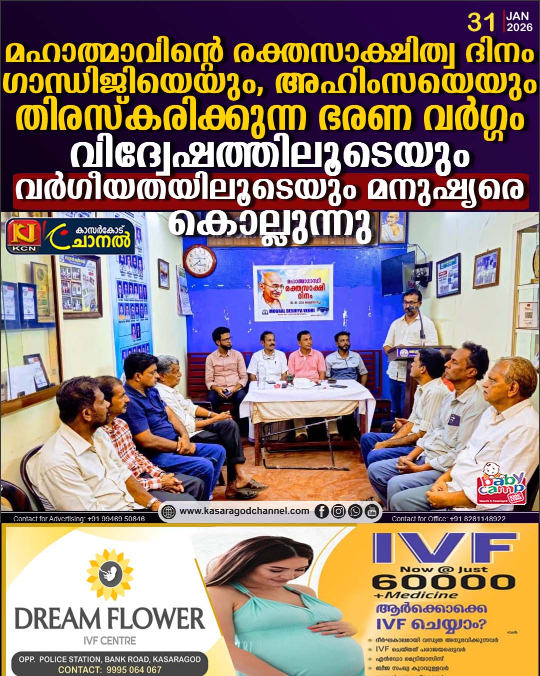 മൊഗ്രാല്.രാജ്യത്ത് രാഷ്ട്രപിതാവ് മഹാത്മജിയേയും, അഹിംസയെയും തിരസ്കരിക്കുന്ന ഭരണകൂടം വിദ്വേഷത്തിലൂടേ യും,വര്ഗീയതയിലൂടേ മനുഷ്യരെ വേട്ടയാടി കൊല്ലുകയാണെന്ന് സാംസ്കാരിക പ്രവര്ത്തകന് ഹമീദ് കാവില് അഭിപ്രായപ്പെട്ടു. മൊഗ്രാല് ദേശീയവേദി മഹാത്മാവിന്റെ രക്തസാക്ഷിത്വ ദിനത്തില് സംഘടിപ്പിച്ച അനുസ്മരണ പരിപാടിയില് സംബന്ധിച്ച് സംസാരിക്കുകയായിരുന്നു അദ്ദേഹം.