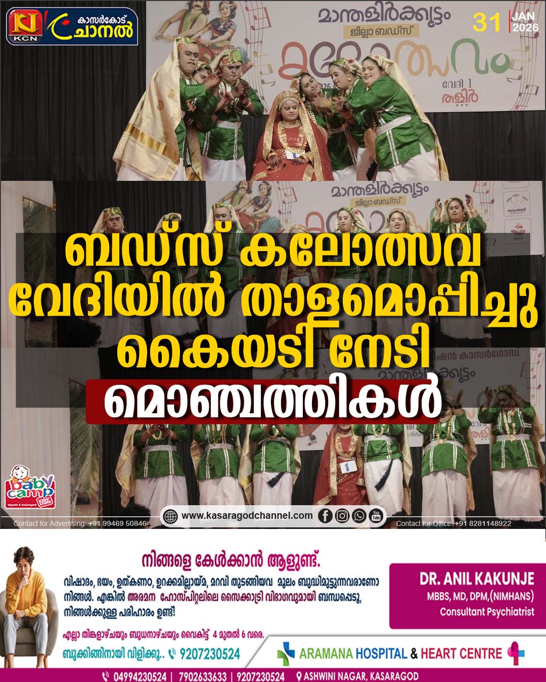 ഉദുമ : മാപ്പിളപ്പാട്ടിന്റെ ഇമ്പമുള്ള ഈണത്തിനൊപ്പം താളമൊപ്പിച്ചു കൈകള് കൊട്ടുമ്പോള് ആ വേദിയില് വിരിഞ്ഞത് ആത്മവിശ്വാസത്തിന്റെ ആയിരം ഇതളുകളായിരുന്നു. തങ്ങളുടെ പരിമിതികളെ തട്ടമിട്ട മൊഞ്ചു കൊണ്ട് മറികടന്ന ബഡ്സ് സ്കൂളിലെ മിടുക്കികള് കോട്ടിക്കുളം നൂറുല് ഹുദ സ്കൂളിലെ കലോത്സവ വേദിയില് വിസ്മയം തീര്ത്തു. കുടുംബശ്രീ ജില്ലാ മിഷന് ഒരുക്കിയ ബഡ്സ് കലോത്സവത്തില് ഒപ്പന മത്സരം വെറുമൊരു മത്സരമല്ല, മറിച്ച് ചേര്ത്തുപിടിക്കലിന്റെ മഹോത്സവമായി മാറി.