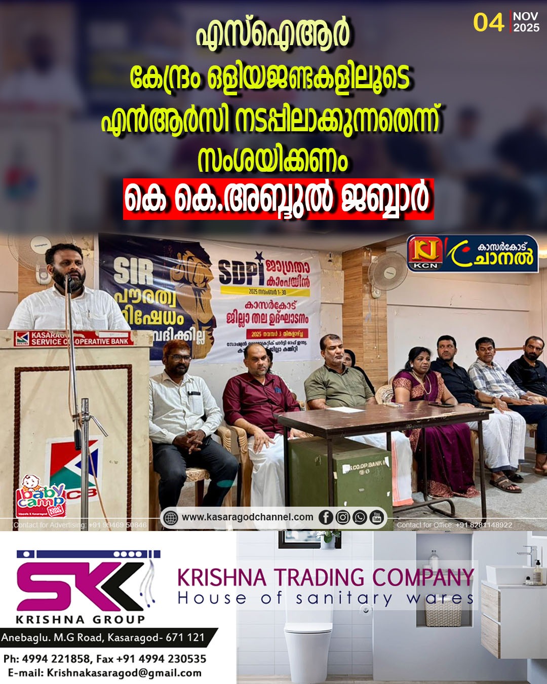 നവംബര് ഒന്നു മുതല് 30 വരെ എസ്ഡിപിഐ സംസ്ഥാന വ്യാപകമായി നടത്തുന്ന ജനജാഗ്രത കാംപയിന്റെ ജില്ലാതല ഉല്ഘാടനം പുതിയ ബസ് സ്റ്റാന്റ് കോ-ഓപററ്റീവ് ബേങ്ക് ഹാളില് ഉദ്ഘാടനം ചെയ്യുകയായിരുന്നു അദ്ദേഹം ജില്ലാ പ്രസിഡന്റ് സിഎ സവാദ് അധ്യക്ഷത വഹിച്ചു.