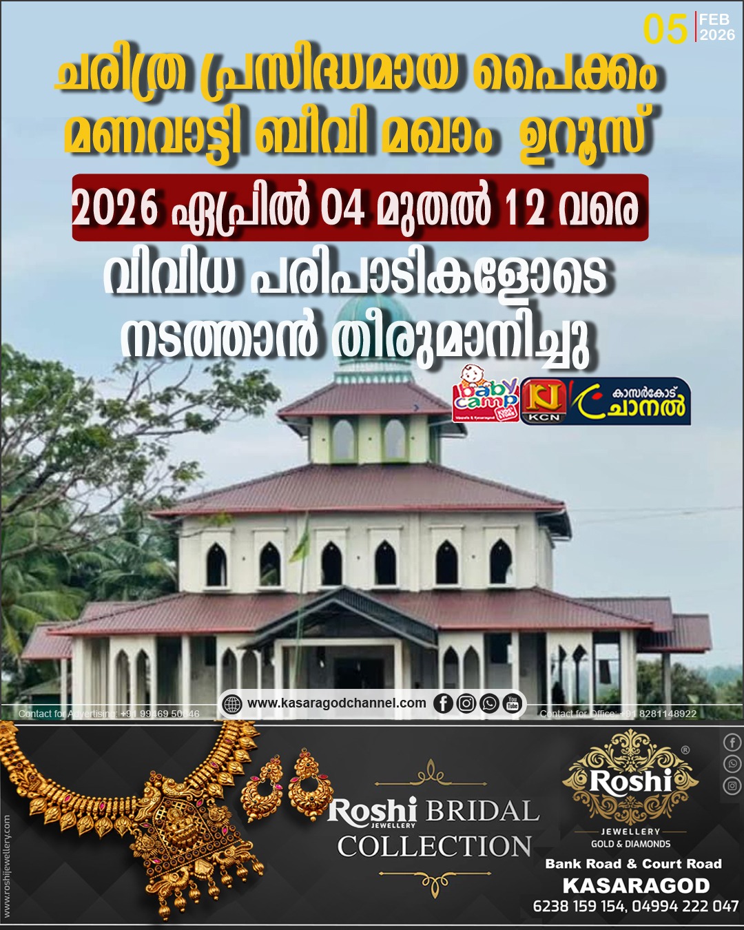 .ചരിത്ര പ്രസിദ്ധമായ പൈക്കം മണവാട്ടി ബീവി മഖാം ഉറൂസ് 2026 ഏപ്രില് 04 മുതല് 12 വരെ വിവിധ പരിപാടികളോടെ നടത്താന് തീരുമാനിച്ചു