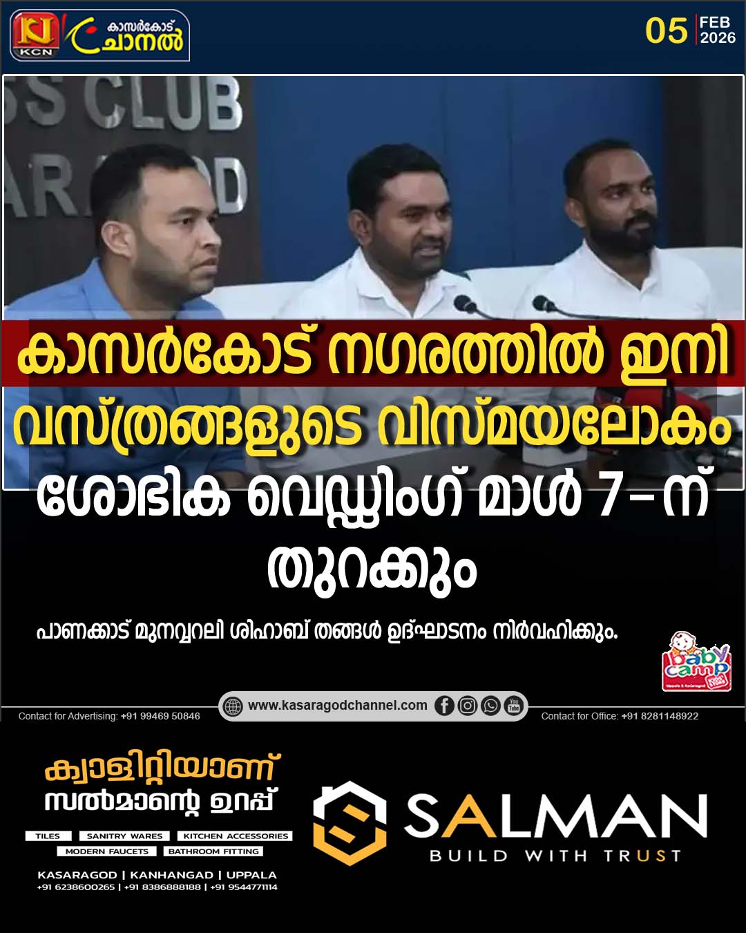 കാസര്കോടിന് പുതിയൊരു വസ്ത്രവിസ്മയം കൂടി; ശോഭിക വെഡ്ഡിംഗ് മാള് ഉദ്ഘാടനത്തിന്റെ വാര്ത്ത ഷെയര് ചെയ്യൂ. വാര്ത്തകള് അപ്പപ്പോള് അറിയാന് ഞങ്ങളുടെ വാട്സ്ആപ്പ് ചാനല് ഫോളോ ചെയ്യൂ.