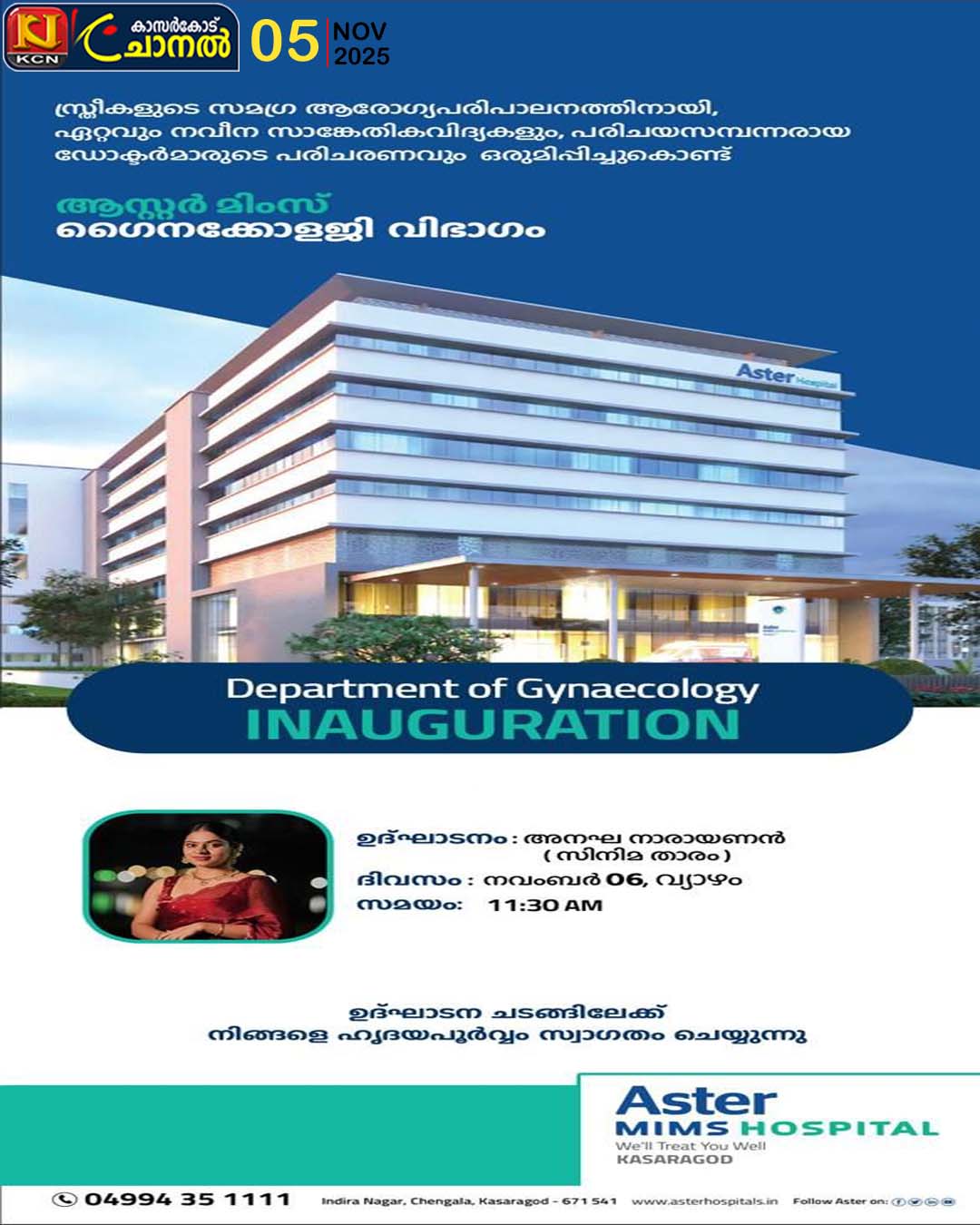 ഉദ്ഘാടനം നവംബര് 6 വ്യാഴാഴ്ച രാവിലെ 11: 30 ന് സിനിമ താരം അനഘ നാരായണന് നിര്വഹിക്കുന്നു