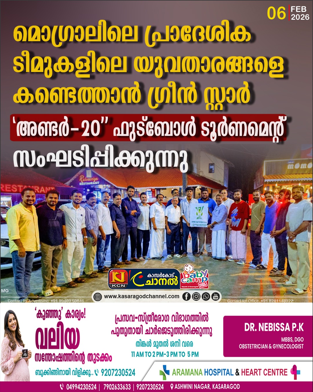 2026 ഫെബ്രുവരി 9ന് തിങ്കളാഴ്ച വൈകുന്നേരം 4.30ന് മൊഗ്രാല് സ്കൂള് മൈതാനത്തെ കുത്തിരിപ്പ് മുഹമ്മദ് ‘സോക്കര് സിറ്റി”യിലാണ് ടൂര്ണമെന്റിന് തുടക്കമാവും.14ന് സമാപിക്കും. മൊഗ്രാലിലെ എട്ടോളം പ്രാദേശിക ക്ലബ്ബുകള് ടൂര്ണമെന്റില് മാറ്റുരക്കും.ഇതിന്റെ’ലോഗോ” കുമ്പള ഗ്രാമ പഞ്ചായത്ത് പ്രസിഡന്റ് വി പി അബ്ദുള് ഖാദര് ഹാജി പ്രകാശനം ചെയ്തു.