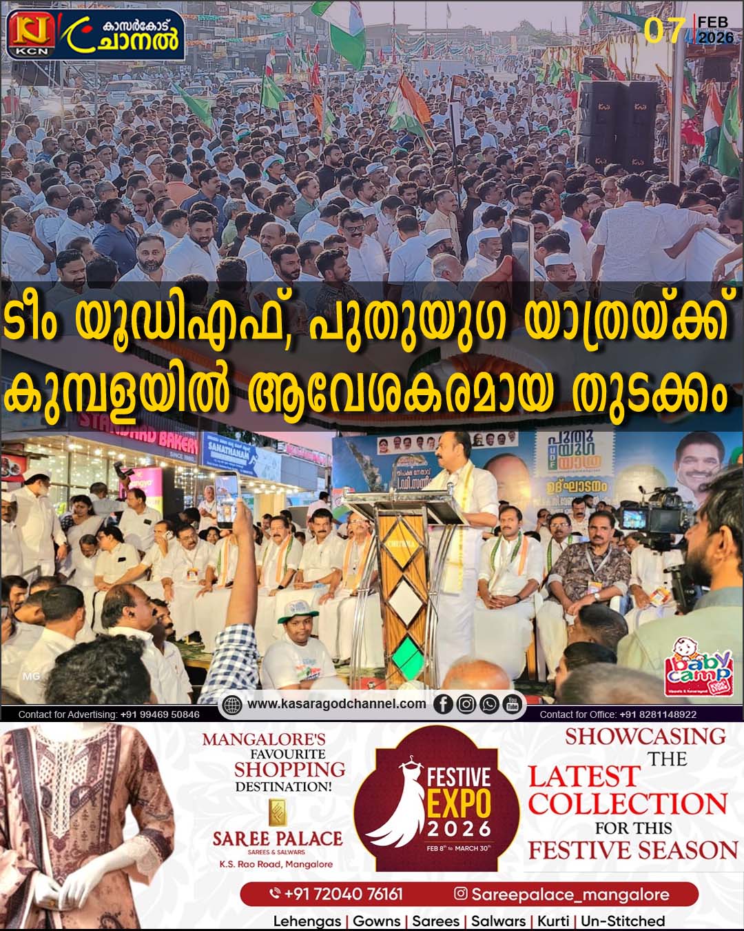 പുതുയുഗ യാത്ര കുമ്പളയില് എഐ സിസി ജനറല് സെക്രട്ടറി കെ സി വേണുഗോപാല് എം പി ഉദ്ഘാടനം ചെയ്തു.കെപിസിസി പ്രസിഡണ്ട് സണ്ണി ജോസഫ് അധ്യക്ഷത വഹിച്ചു.യുഡിഎഫ് കണ്വീനര് അടൂര് പ്രകാശ് എം പി സ്വാഗതം പറഞ്ഞു.ജാഥ വൈസ് ക്യാപ്റ്റന് പി കെ കുഞ്ഞാലിക്കുട്ടി എം എല് എ,കോണ്ഗ്രസ് പ്രവര്ത്തകസമിതി അംഗം രമേശ് ചെന്നിത്തല എംഎല്എ,കെ മുരളീധരന് എംപി,എം കെ രാഘവന് എംപി,ബെന്നി ബഹനാന് എംപി,രാജ്മോഹന് ഉണ്ണിത്താന് എംപി,കെ മുരളീധരന് എംപി,കെ സുധാകരന് എം പി, മുസ്ലിം ലീഗ് സംസ്ഥാന ജനറല് സെക്രട്ടറി പി എം എ സലാം,ജനശ്രീ മിഷന് ചെയര്മാന് എം എം ഹസ്സന്,കൊടിക്കുന്നില് സുരേഷ് എംപി,എം കെ പ്രേമചന്ദ്രന് എംപി, ഷാഫി പറമ്പില് എംപി,ഘടകകക്ഷി നേതാക്കളായ ഷിബു ബേബി ജോണ്,പി ജെ ജോസഫ്,സി പി ജോണ്, എംഎല്എമാരായ പി വി അന്വര്,എ കെ എം അഷറഫ്,എന് എ നെല്ലിക്കുന്ന്,മാത്യു കുഴല്നാടന്,എന് ഷംസുദ്ദീന്,ചാണ്ടി ഉമ്മന്,പി സി വിഷ്ണുനാഥ്,മാത്യു കുഴല്നാടന്,കോണ്ഗ്രസ് നേതാക്കളായ സന്ദീപ് വാര്യര്,അബിന് വര്ക്കി,റെജി എം ജോണ്,എസി ബാലകൃഷ്ണന്, വികെ മിനിമോള്, ജില്ലാ മുസ്ലിം ലീഗ് പ്രസിഡണ്ട് കല്ലട്ര മാഹിന് ഹാജി,കോണ്ഗ്രസ് ജില്ലാ പ്രസിഡണ്ട് പികെ ഫൈസല് തുടങ്ങിയ യുഡിഎഫിന്റെ നേതാക്കളുടെ പട തന്നെ ഉദ്ഘാടന ചടങ്ങില് സംബന്ധിച്ചു.തിങ്ങി നിറഞ്ഞ സദസ്സില് ആവേശത്താല് വി ഡി സതീശനെ തോളിലെത്തി യുഡിഎഫ് പ്രവര്ത്തകര് മുദ്രാവാക്യം മുഴക്കി.