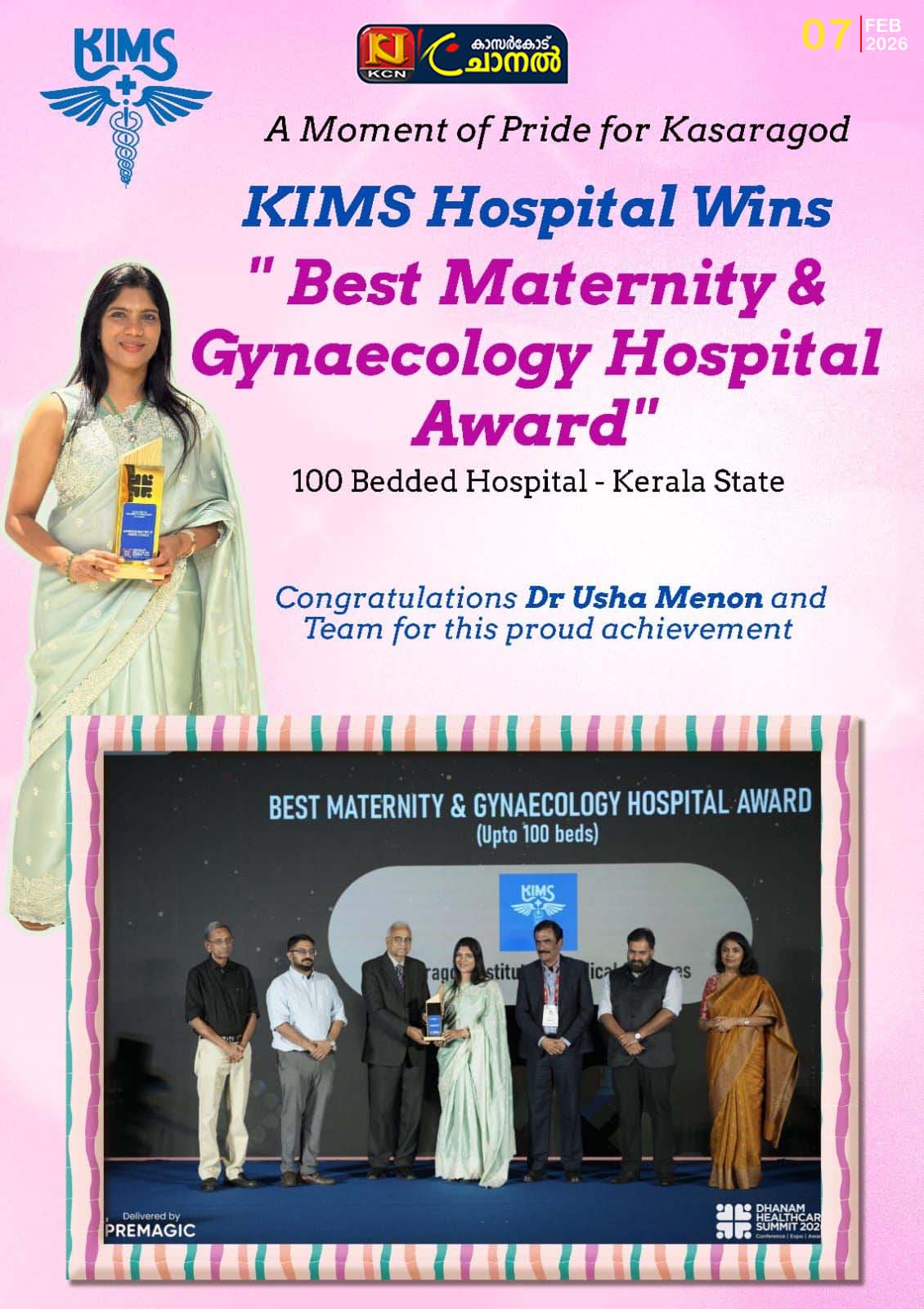 കാസര്കോടിന് ഒരു അഭിമാന നിമിഷം കിംസ് ആശുപത്രി മികച്ച പ്രസൂതി-ഗൈനക്കോളജി ആശുപത്രിക്കുള്ള അവാര്ഡ് നേടിBy kcnchannel / February 7, 2026