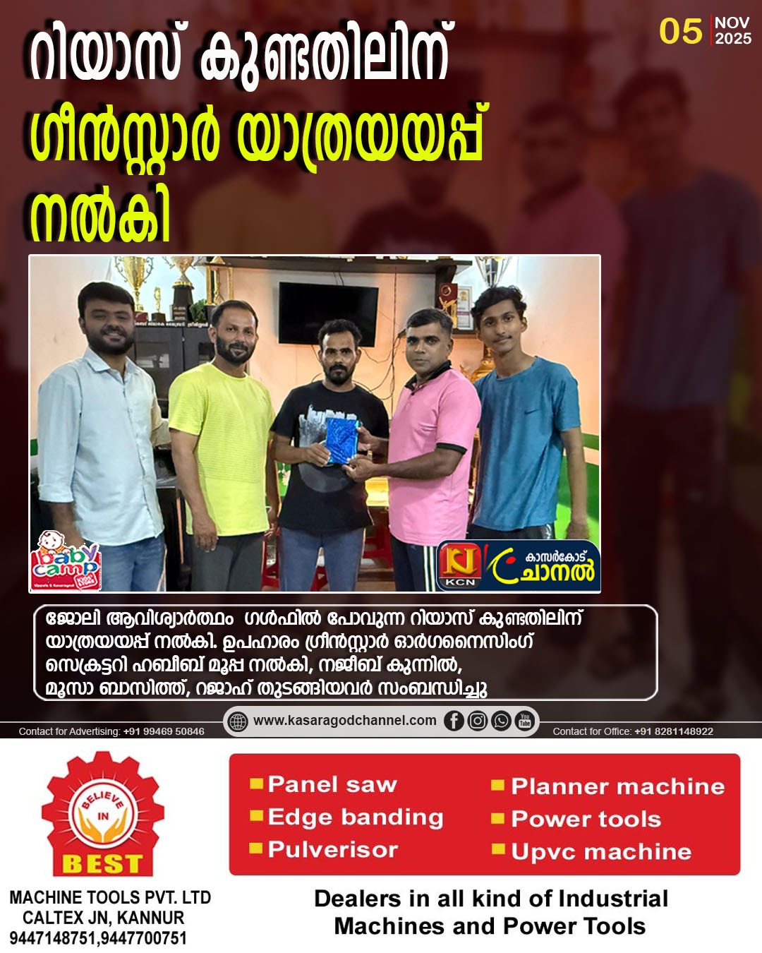 ഉപഹാരം ഗ്രീന്സ്റ്റാര് ഓര്ഗനൈസിംഗ് സെക്രട്ടറി ഹബീബ് മൂപ്പ നല്കി, നജീബ് കുന്നില്, മൂസാ ബാസിത്ത്, റജാഹ് തുടങ്ങിയവര് സംബന്ധിച്ചു