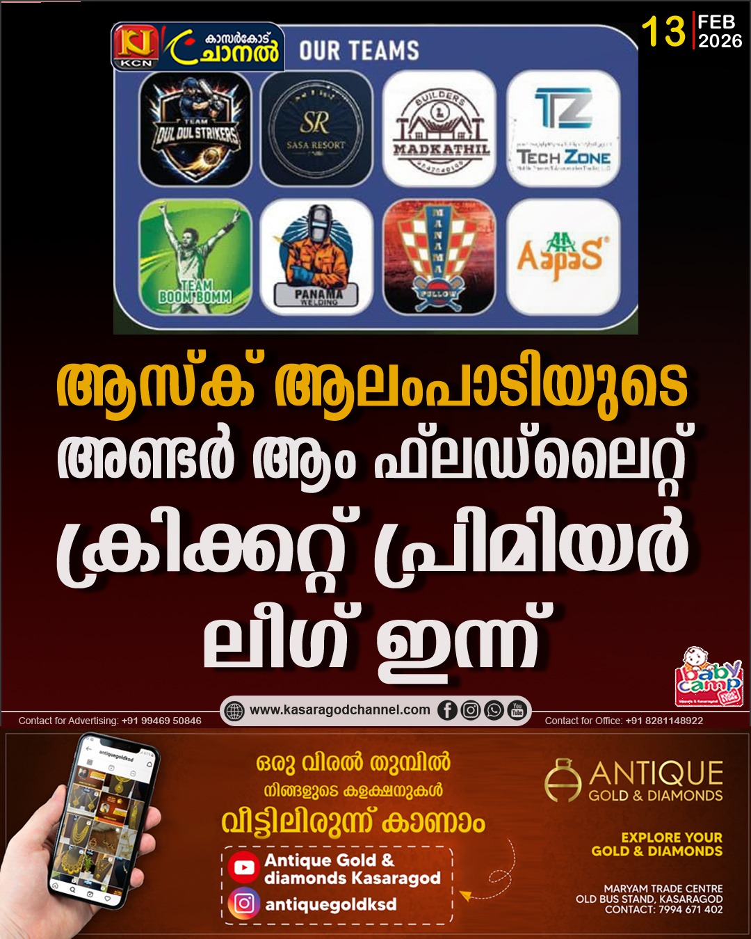 ആസ്ക് ആലംപാടിയുടെ അണ്ടര് ആം ഫ്ലഡ്ലൈറ്റ് ക്രിക്കറ്റ് പ്രിമിയര് ലീഗ് ഇന്ന്