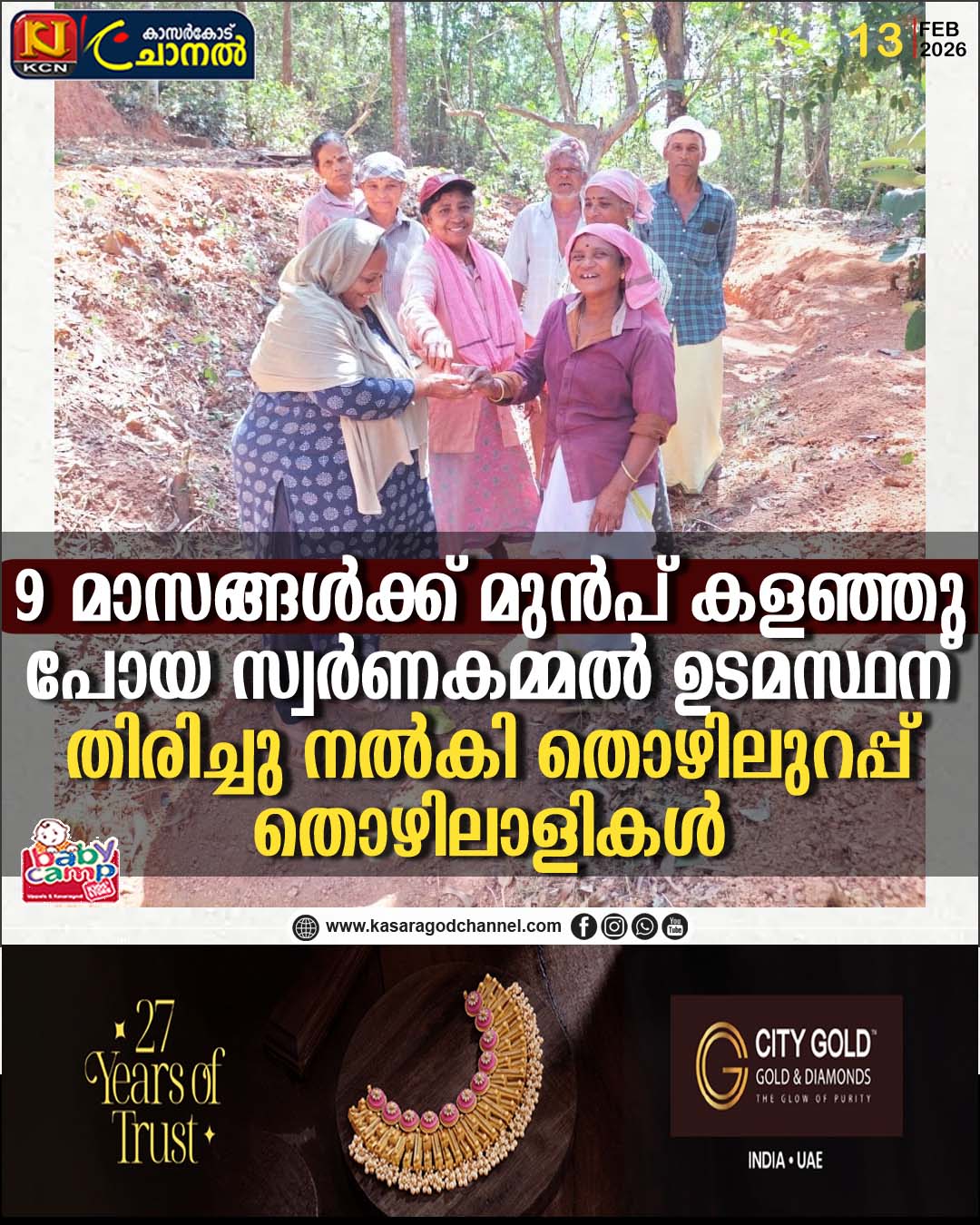 9 മാസങ്ങള്ക്ക് മുന്പ് കളഞ്ഞു പോയ സ്വര്ണകമ്മല് ഉടമസ്ഥന് തിരിച്ചു നല്കി തൊഴിലുറപ്പ് തൊഴിലാളികള്.
