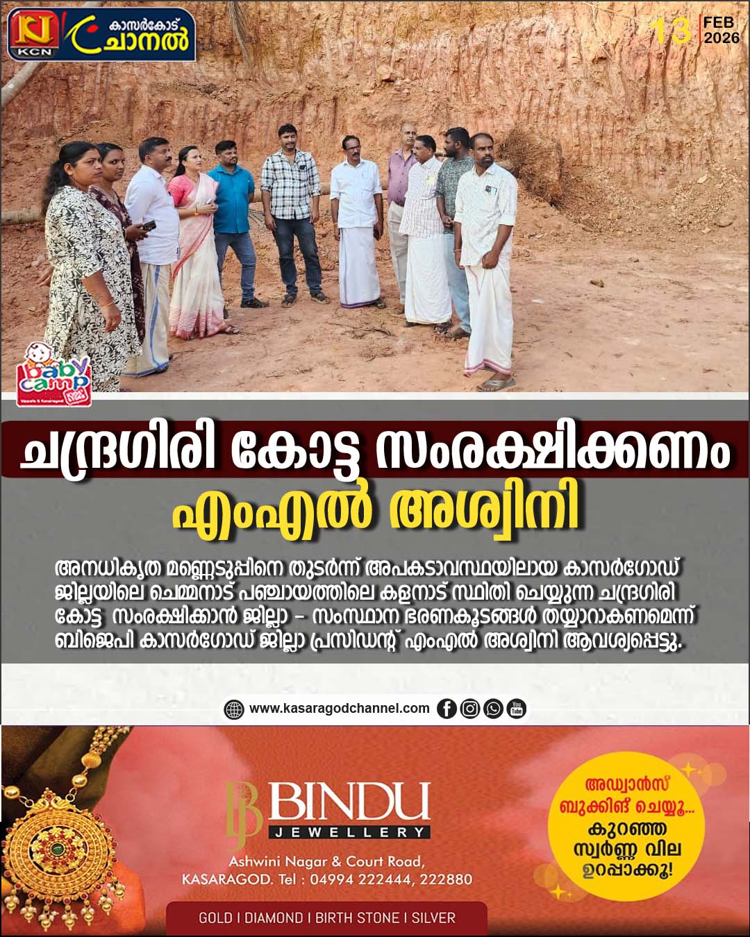 ബിജെപി കാസര്ഗോഡ് ജില്ലാ ജനറല് സെക്രട്ടറി എന്. ബാബുരാജ്, ബിജെപി ജില്ലാ സെക്രട്ടറി കെ.ടി. പുരുഷോത്തമന്, ജില്ലാ കമ്മിറ്റി അംഗം ശ്രീനിവാസന് കീഴൂര്, ഉദുമ മണ്ഡലം വൈസ് പ്രസിഡന്റ് സദാശിവന് മണിയങ്ങാനം, സെക്രട്ടറി സൗമ്യ പത്മനാഭന്, ട്രഷറര് രതീഷ് വി.എ, ചെമ്മനാട് വെസ്റ്റ് ഏരിയ പ്രസിഡണ്ട് രാജേഷ് കൈന്താര്, ചെമ്മനാട് വെസ്റ്റ് ഏരിയ കമ്മിറ്റി അംഗങ്ങളായ പ്രമോദ് കീഴൂര്, ഹരീഷ് പള്ളിപ്പുറം എന്നിവര്ക്കൊപ്പം പ്രസ്തുത സ്ഥലം സന്ദര്ശിച്ച ശേഷം പ്രതികരിക്കുകയായിരുന്നു എം.എല്. അശ്വിനി.