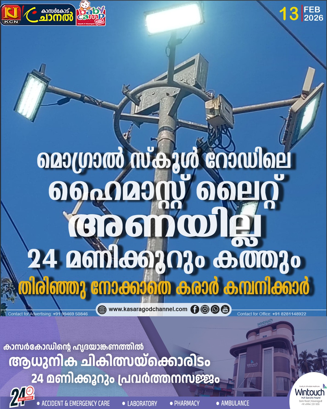 മൊഗ്രാല്. മൊഗ്രാല്-പേരാല് റോഡില് ജിവിഎച്ച്എസ്എസ് മൊഗ്രാല് സ്കൂളിന് മുന്വശം സ്ഥാപിച്ച ഹൈമാസ്റ്റ് ലൈറ്റ് 24 മണിക്കൂറും കത്തും. ഓഫ് ചെയ്യാന് സംവിധാനമില്ല,കരാര് കമ്പനിക്കാരെ വിളിച്ചാലും പ്രയോജനമില്ലെന്ന് പരിസരവാസികള്.
