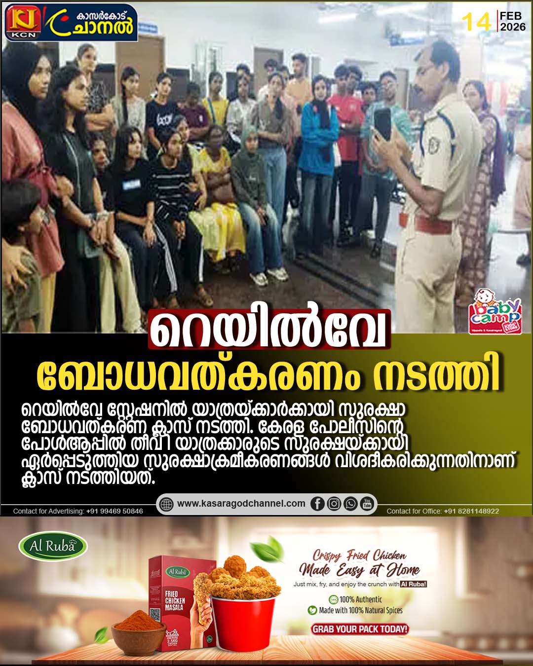 ബോധവത്കരണ ക്ലാസ് നടത്തി. കേരള പോലീസിന്റെ പോള്ആപ്പില് തീവണ്ടി യാത്രക്കാരുടെ സുരക്ഷയ്ക്കായി ഏര്പ്പെടുത്തിയ സുരക്ഷാക്രമീകരണങ്ങള് വിശദീകരിക്കുന്നതിനാണ് ക്ലാസ് നടത്തിയത്. ആപ്പില് റെയില്മൈത്രി സര്വീസസ് എന്ന പേരില് അഞ്ച് പുതിയ ക്രമീകരണങ്ങളാണ് ഉള്പ്പെടുത്തിയിരിക്കുന്നത്.