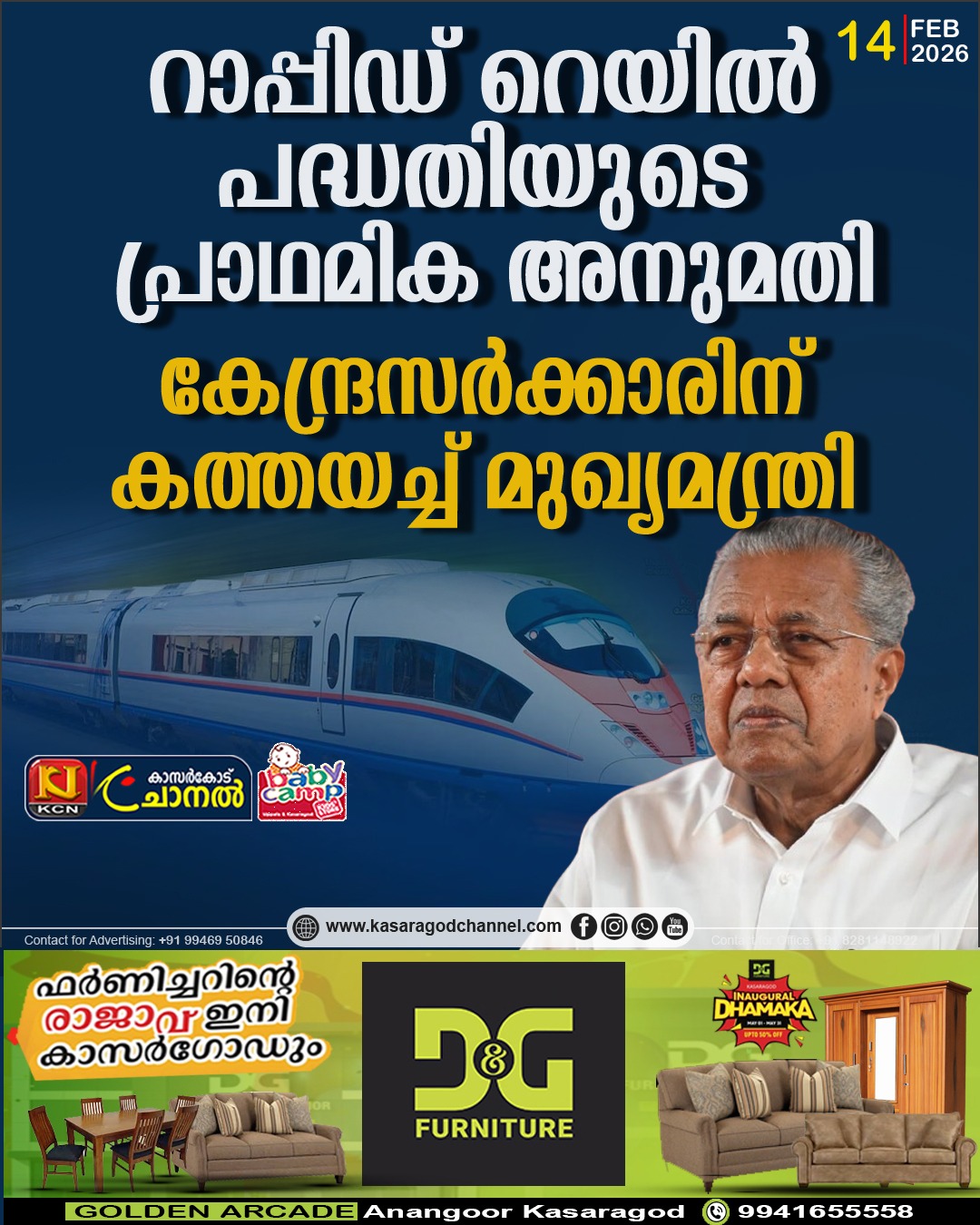 റാപ്പിഡ് റെയില് പദ്ധതിയുടെ പ്രാഥമിക അനുമതിക്കായി കേന്ദ്രസര്ക്കാരിന് മുഖ്യമന്ത്രി കത്തയച്ചു. വിശദ പദ്ധതി റിപോര്ട്ട് തയാറാക്കുന്നതിനുള്ള ഫണ്ടിനും കേന്ദ്ര സര്ക്കാരുമായുള്ള തുടര്ചര്ച്ചകള്ക്കുമാണ് മുഖ്യമന്ത്രി കേന്ദ്രനഗരകാര്യ മന്ത്രി മനോഹര് ലാല് ഖട്ടറിന് കത്തയച്ചിരിക്കുന്നത്. തിരഞ്ഞെടുപ്പ് പ്രഖ്യാപിക്കും മുന്പേ കേന്ദ്ര സര്ക്കാരില് നിന്നും അനുമതി നേടിയെടുക്കുകയാണ് സര്ക്കാര് ലക്ഷ്യമിടുന്നത്. (RRTS