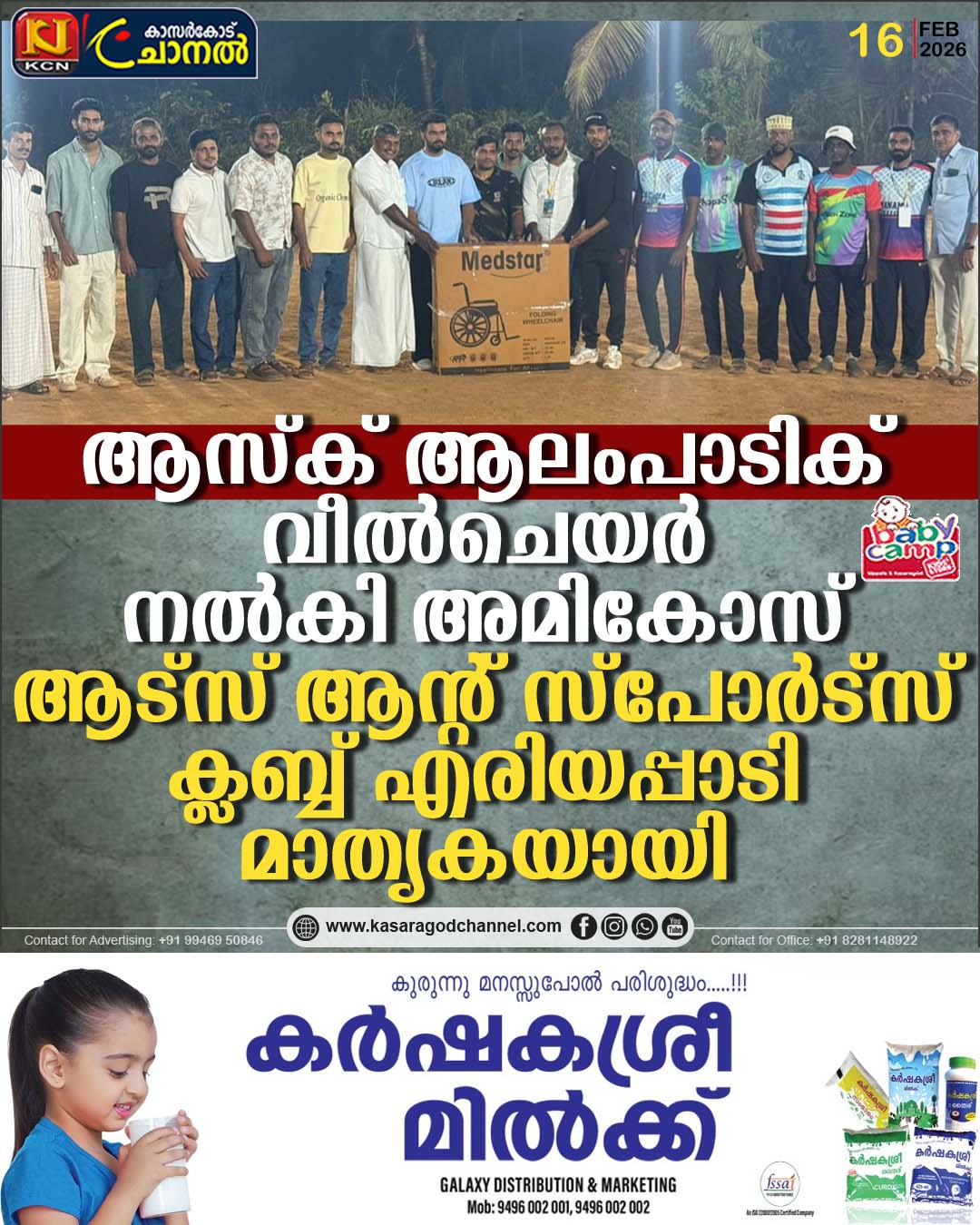 ആസ്ക് ആലംപാടിക് വീല്ചെയര് നല്കി അമികോസ് ആട്സ് ആന്റ് സ്പോര്ട്സ് ക്ലബ്ബ് എരിയപ്പാടി മാതൃകയായി