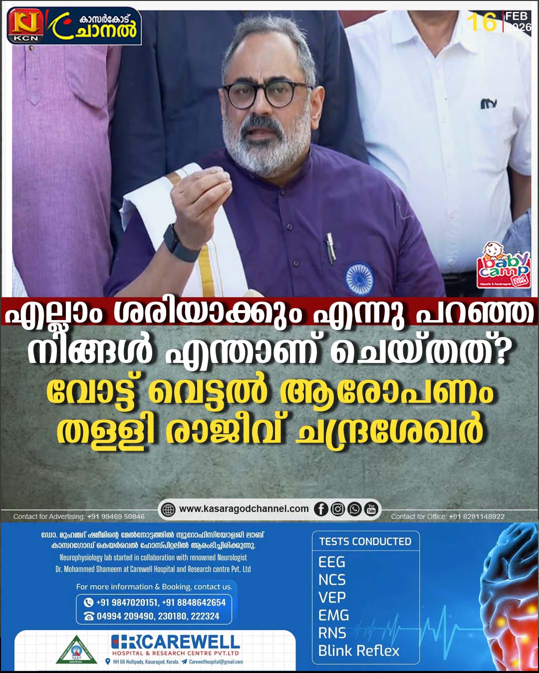 10 കൊല്ലം കേന്ദ്രം ഒന്നും തന്നില്ലെന്നു പറയുന്നവരോട് എല്ലാം ശരിയാക്കും എന്നു പറഞ്ഞ നിങ്ങള് എന്താണ് ചെയ്തതെന്നാണ് തിരിച്ചു ചോദിക്കാനുള്ളത്. മുഖ്യമന്ത്രിയെ പരസ്യ സംവാദത്തിന് അദ്ദേഹം വീണ്ടും വെല്ലുവിളിച്ചു. സംവാദത്തില് കൂടുതല് സമയം മുഖ്യമന്ത്രി എടുത്തോട്ടെ അതിനെ പൊളിക്കാന് തനിക്ക് 15 മിനിറ്റ് മതിയെന്നും രാജീവ് ചന്ദ്രശേഖര് പറഞ്ഞു. എയിംസ് വരാന് ബജറ്റ് പ്രഖ്യാപനം വേണ്ട. വന്ദേഭാരത് കേരളത്തിലൂടെ ഓടുന്നത് ബജറ്റ് പ്രഖ്യാപനത്തിന്റെ അടിസ്ഥാനത്തിലല്ല. എയിംസിനു സംസ്ഥാന സ്ഥലം ഏറ്റെടുത്തു നല്കാത്തതു മാത്രമാണ് പ്രശ്നമെന്നും അദ്ദേഹം പറഞ്ഞു.