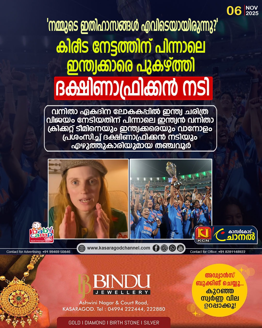 വനിതാ ഏകദിന ലോകകപ്പില് ഇന്ത്യ ചരിത്ര വിജയം നേടിയതിന് പിന്നാലെ ഇന്ത്യന് വനിതാ ക്രിക്കറ്റ് ടീമിനെയും ഇന്ത്യക്കരെയും വാനോളം പ്രശംസിച്ച് ദക്ഷിണാഫ്രിക്കന് നടിയും എഴുത്തുകാരിയുമായ തഞ്ച വൂര്. അവര് സ്വന്തം സ്വന്തം രാജ്യം ദക്ഷിണാഫ്രിക്കന് ടീമിന് നിശിതമായി വിമര്ശിക്കുകയും ചെയ്തു.