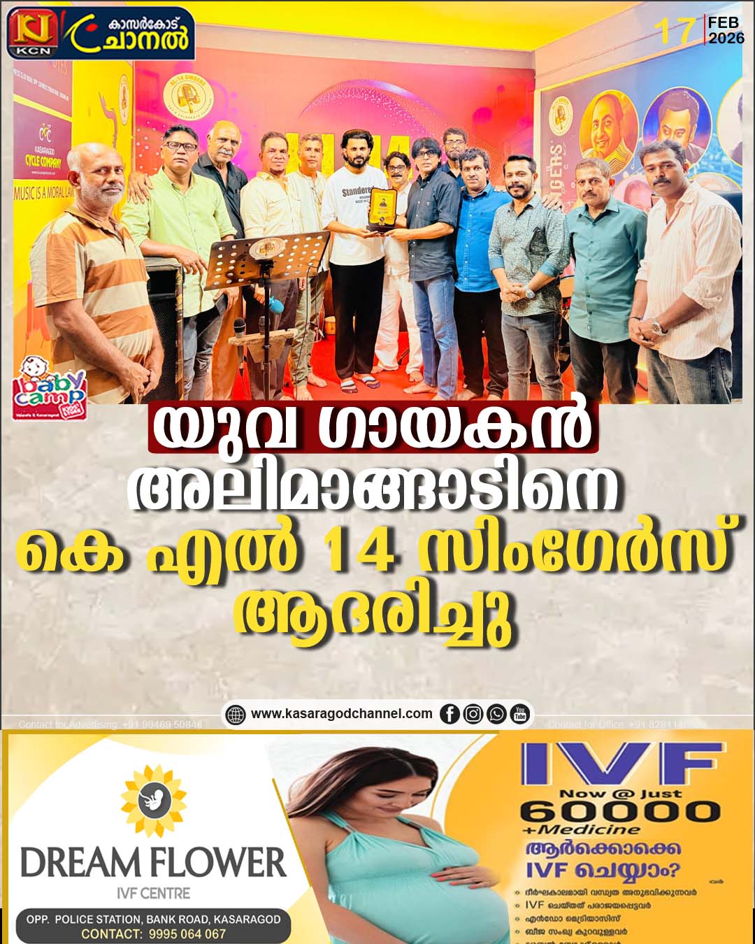 കാസര്കോട്: വളര്ന്ന് വരുന്ന ഗായകന്മാരെ ആദരിക്കുന്നതിന്റെ ഭാഗമായി കത്തുപാട്ടിലൂടെ വൈറലായ അലി മാങ്ങാടിനെ കെ എല് 14 സിംഗേര്സ് ആദരിച്ചു