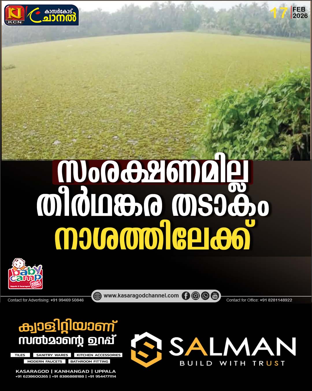 തൊട്ടടുത്ത പ്രദേശങ്ങള് കനത്ത വരള്ച്ചയിലും ഉപ്പുവെള്ളക്കെടുതിയിലും ദാഹജലത്തിനായി മുറവിളികൂട്ടുമ്പോള് ഇവിടെ 10 ഏക്കറിലധികം വ്യാപിച്ചുകിടക്കുന്ന ഈ ശുദ്ധജലതടാകം സംരക്ഷണമില്ലാതെ പായല് നിറഞ്ഞ് കിടക്കുന്നു.