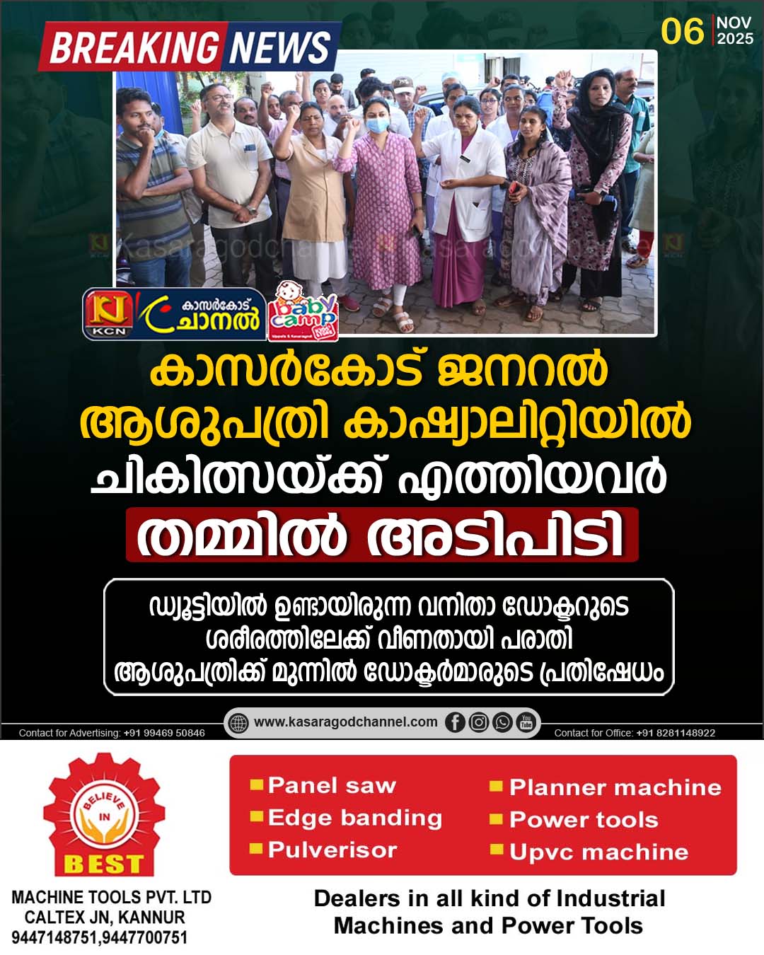 കാസര്കോട് ജനറല് ആശുപത്രി കാഷ്യലിറ്റിയില് ചികിത്സയ്ക്ക് എത്തിയവര് തമ്മില് അടിപിടിBy kcnchannel / November 6, 2025 ഡ്യൂട്ടിയില് ഉണ്ടായിരുന്ന വനിതാ ഡോക്ടറുടെ ശരീരത്തിലേക്ക് വീണതായി പരാതി ആശുപത്രിക്ക് മുന്നില് ഡോക്ടര്മാരുടെ പ്രതിഷേധം