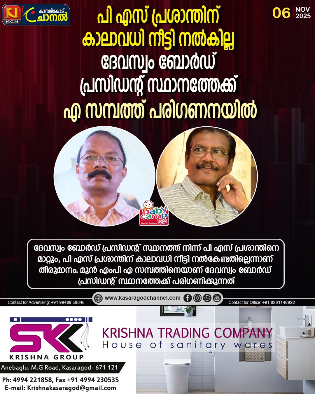 തിരുവനന്തപുരം: ദേവസ്വം ബോര്ഡ് പ്രസിഡന്റ് സ്ഥാനത്ത് നിന്ന് പി എസ് പ്രശാന്തിനെ മാറ്റും. പി എസ് പ്രശാന്തിന് കാലാവധി നീട്ടി നല്കേണ്ടതില്ലെന്നാണ് തീരുമാനം. മുന് എംപി എ സമ്പത്തിനെയാണ് ദേവസ്വം ബോര്ഡ് പ്രസിഡന്റ് സ്ഥാനത്തേക്ക് പരിഗണിക്കുന്നത്. ഇക്കാര്യത്തില് സിപിഐഎം നേതൃത്വം തീരുമാനമെടുത്തതായാണ് പുറത്തുവരുന്ന വിവരം. കെ രാധാകൃഷ്ണന് ദേവസ്വം മന്ത്രിയായിരുന്ന കാലത്ത് അദ്ദേഹത്തിന്റെ പിഎയായിരുന്നു എ സമ്പത്ത്.