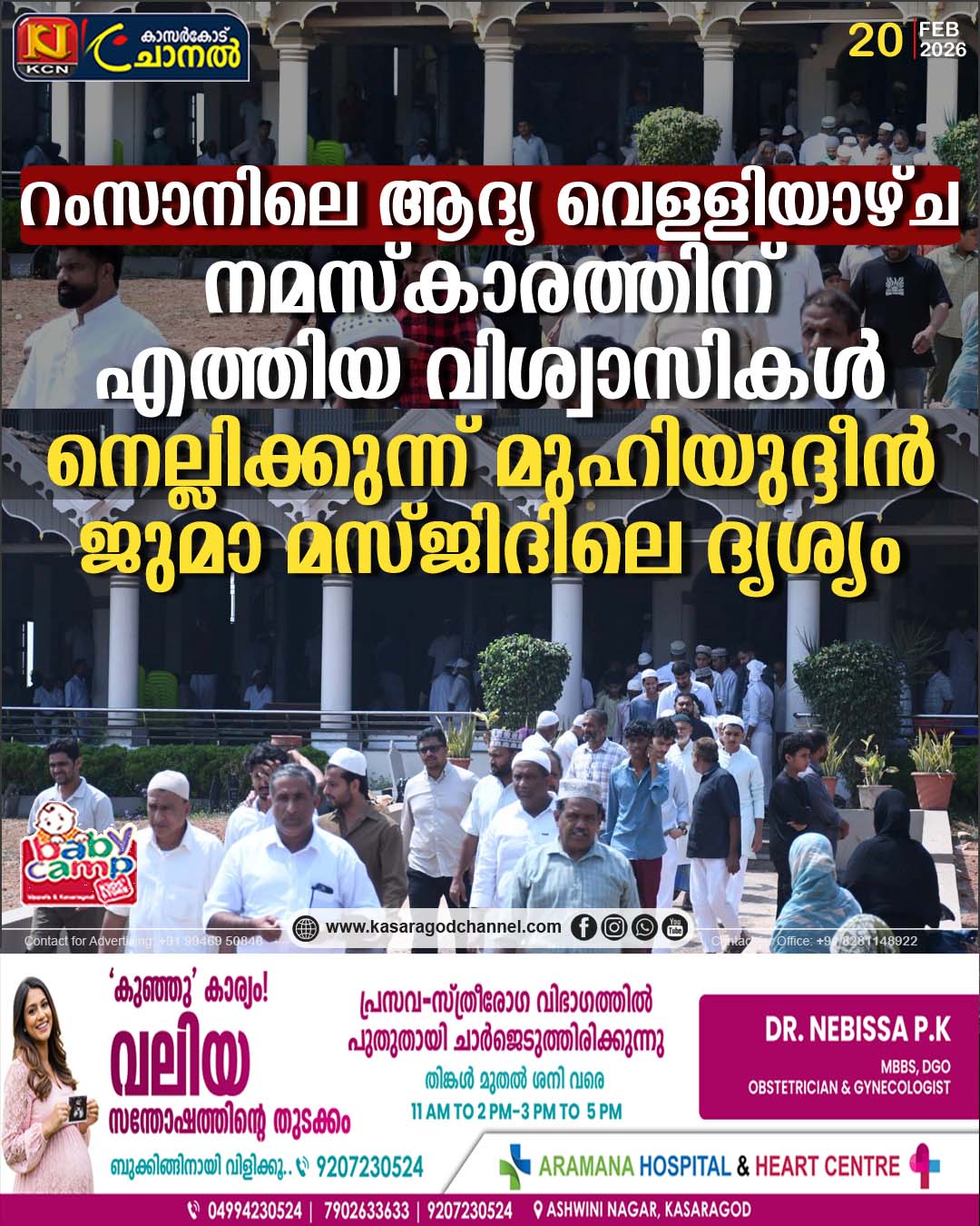 റംസാനിലെ ആദ്യ വെള്ളിയാഴ്ച നമസ്കാരത്തിന് എത്തിയ വിശ്വാസികള് –നെല്ലിക്കുന്ന് മുഹിയുദ്ദീന് ജുമാ മസ്ജിദിലെ ദൃശ്യംBy kcnchannel / February 20, 2026